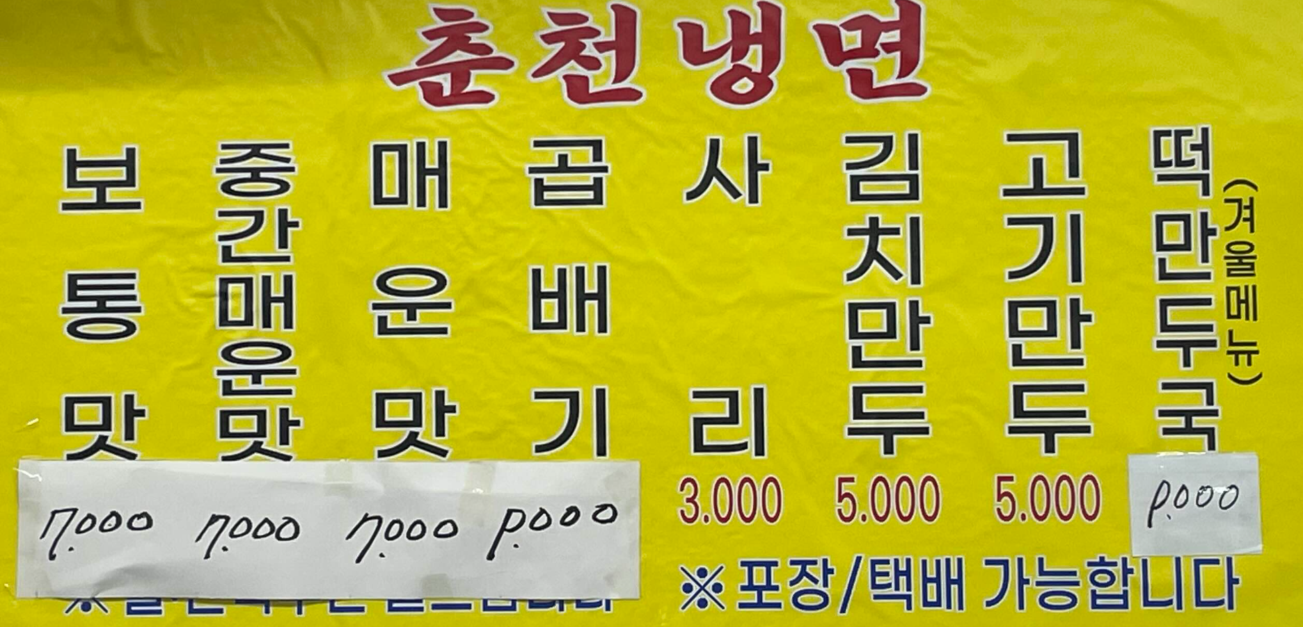 냉면은 7,000원, 만두는 5개 5,000원이다.