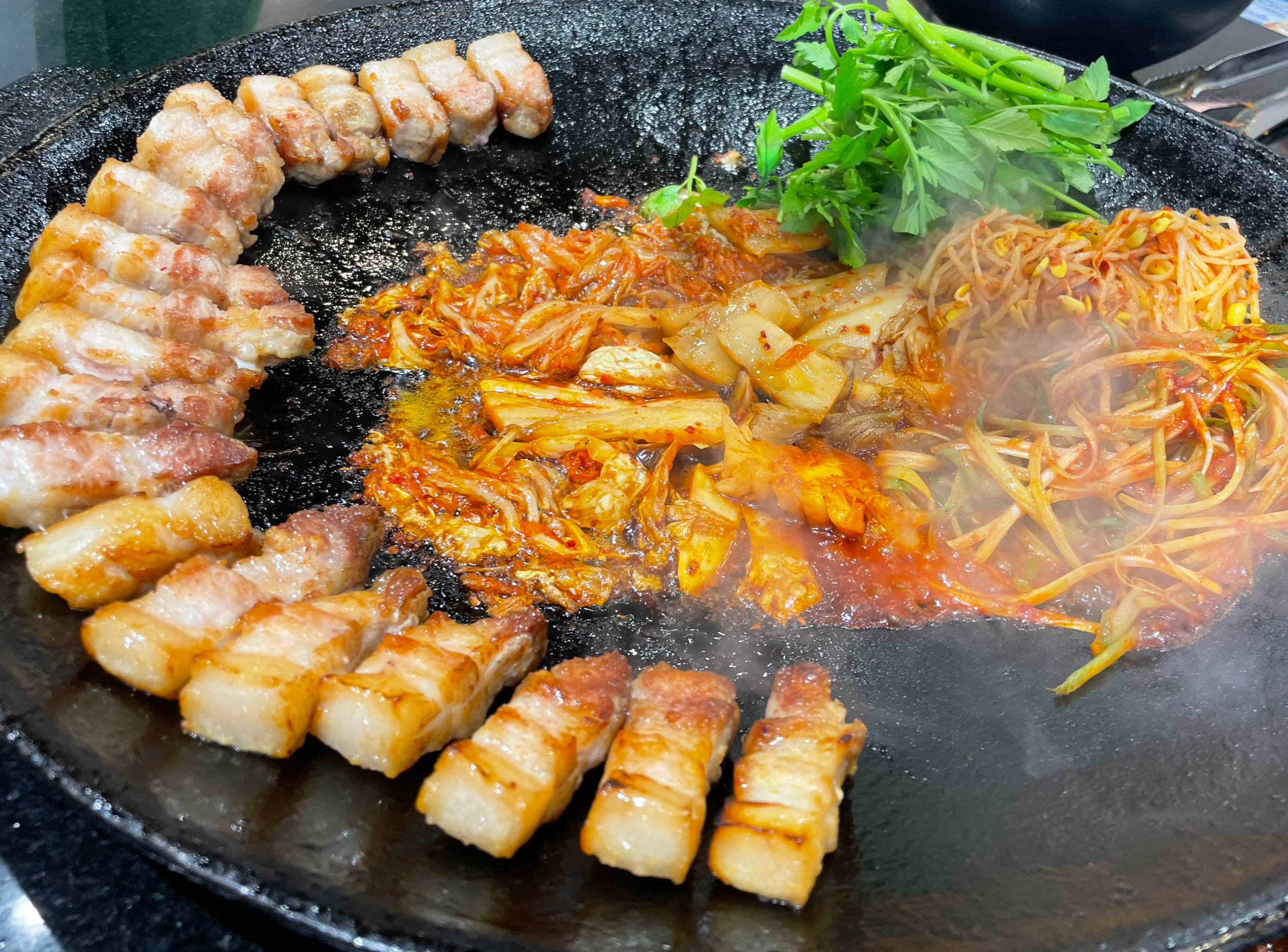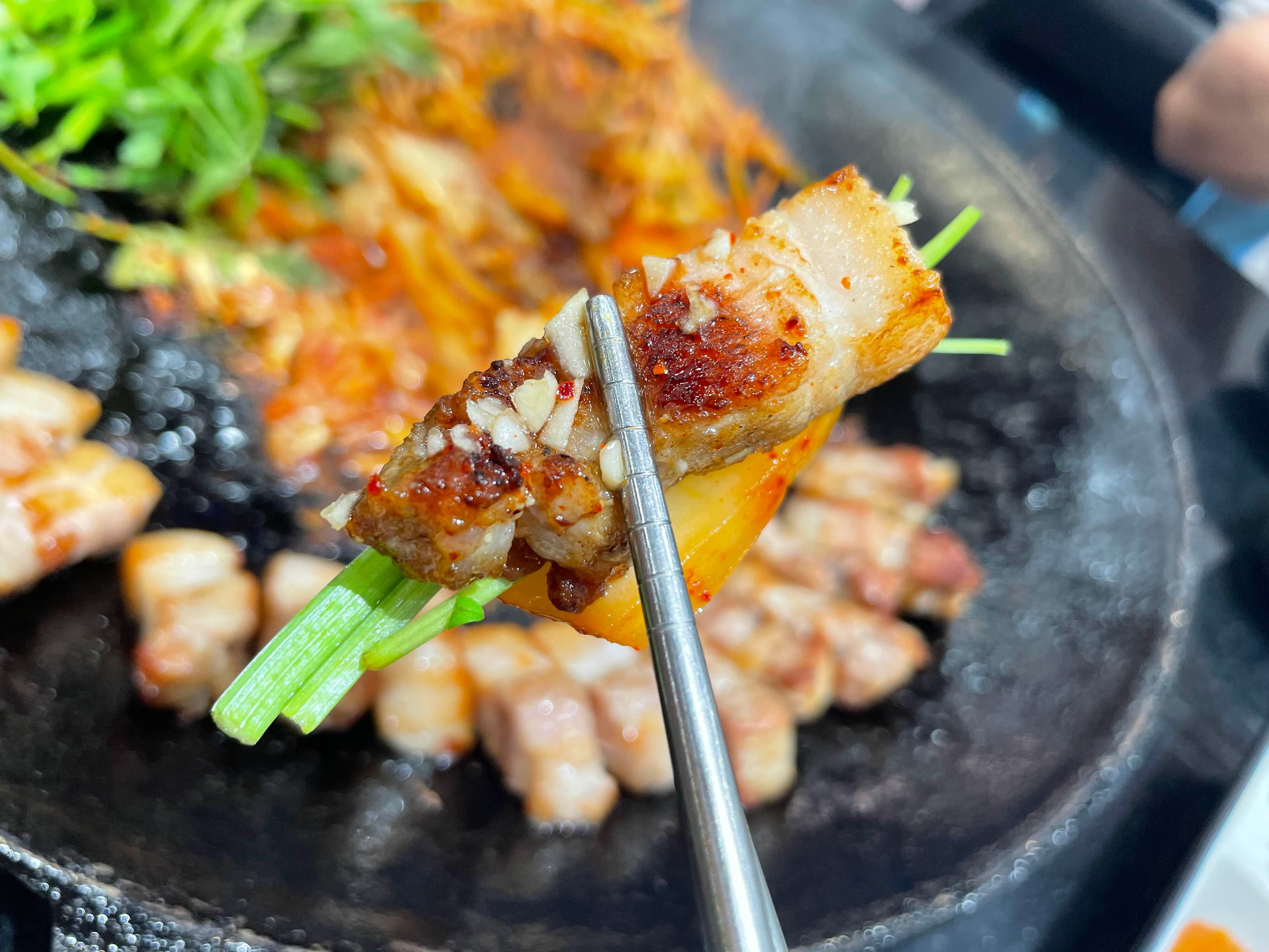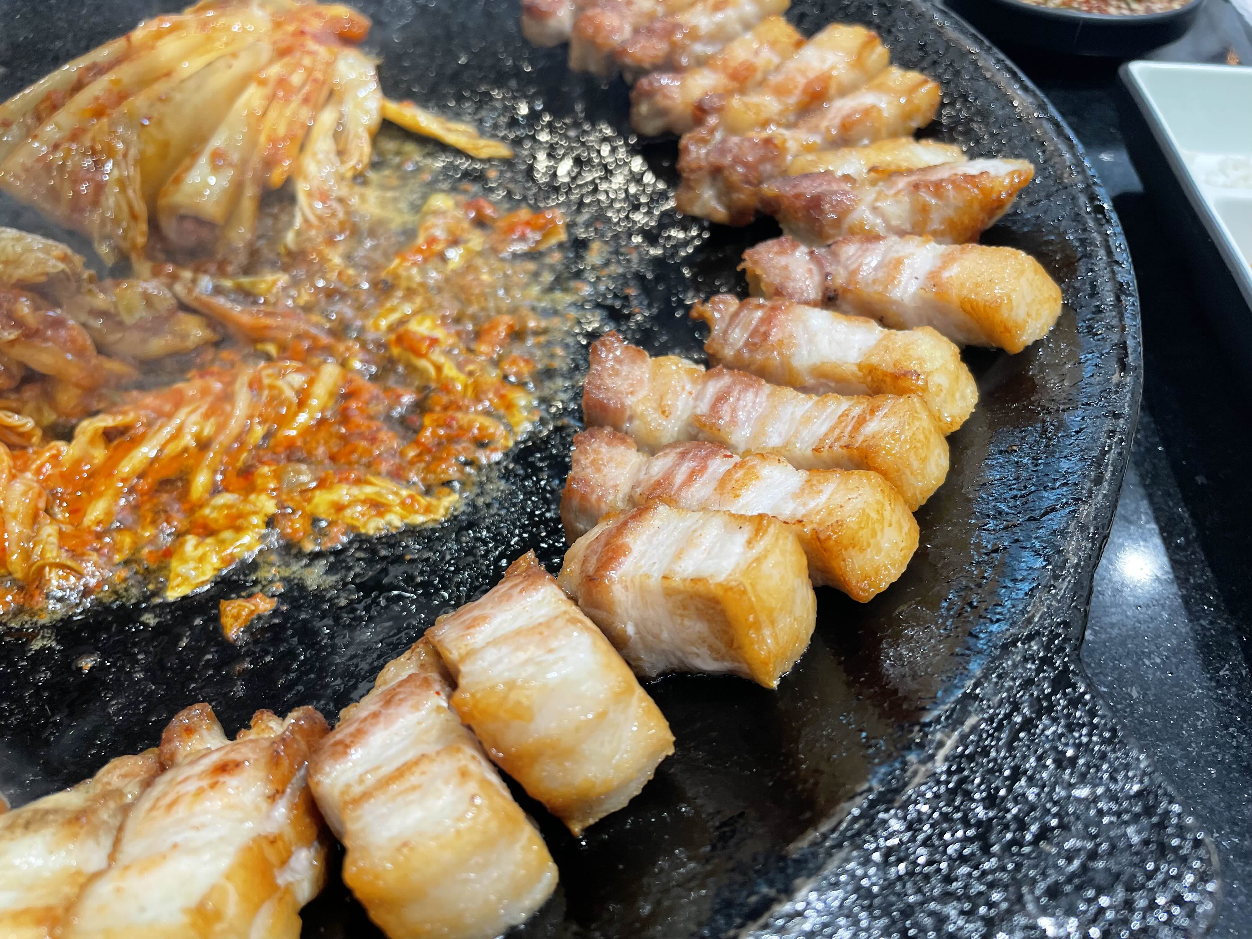 ✔️ 두툼한 솥뚜껑에 새콤하게 익은 김치랑 두툼한 삼겹살을 노릇하게 구워 먹으니 지상낙원이 따로 없다.