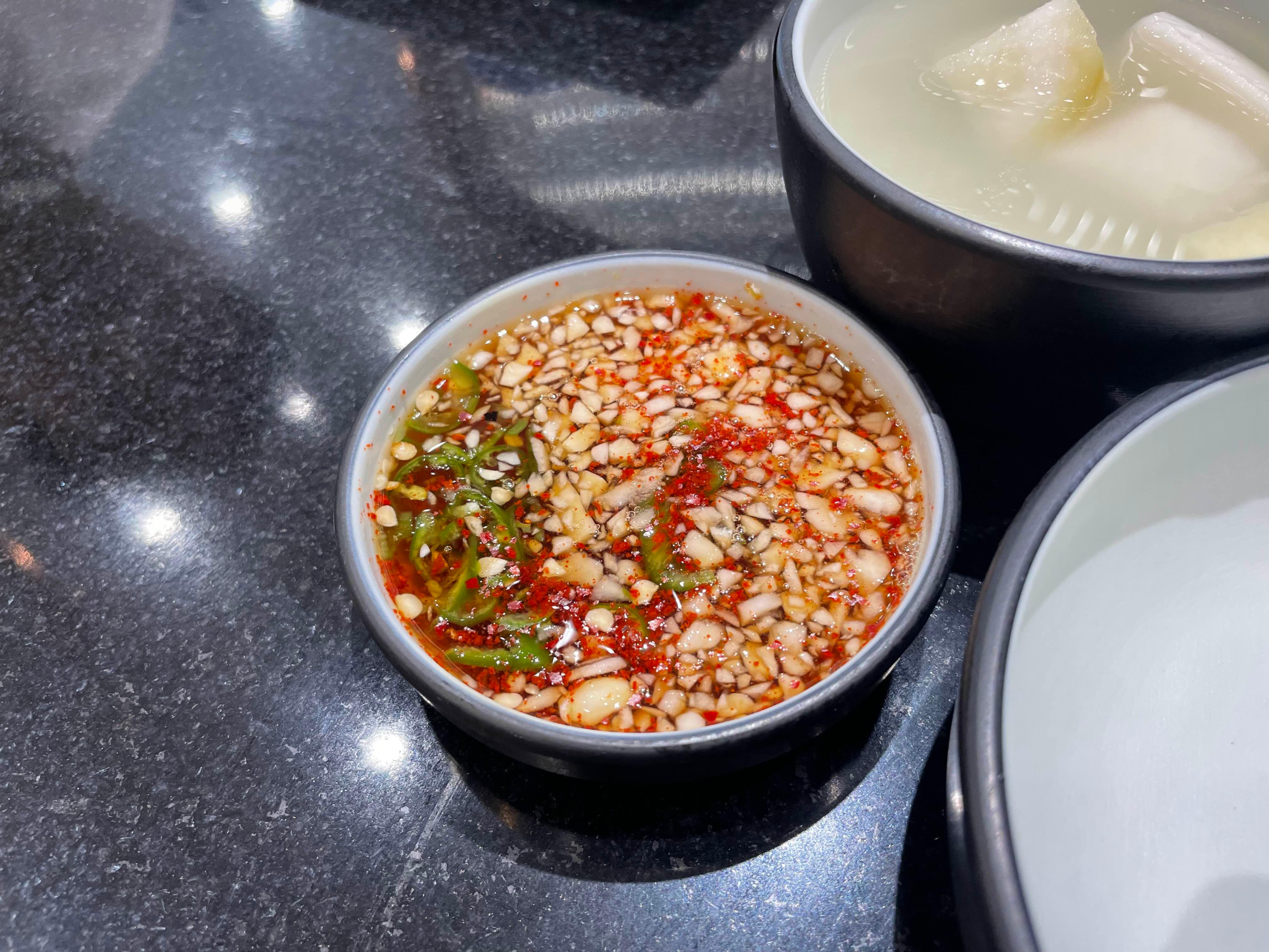 고기 찍어먹는 소스도 마늘 듬뿍, 고추 듬뿍, 고춧가루 듬뿍 들어가 있어