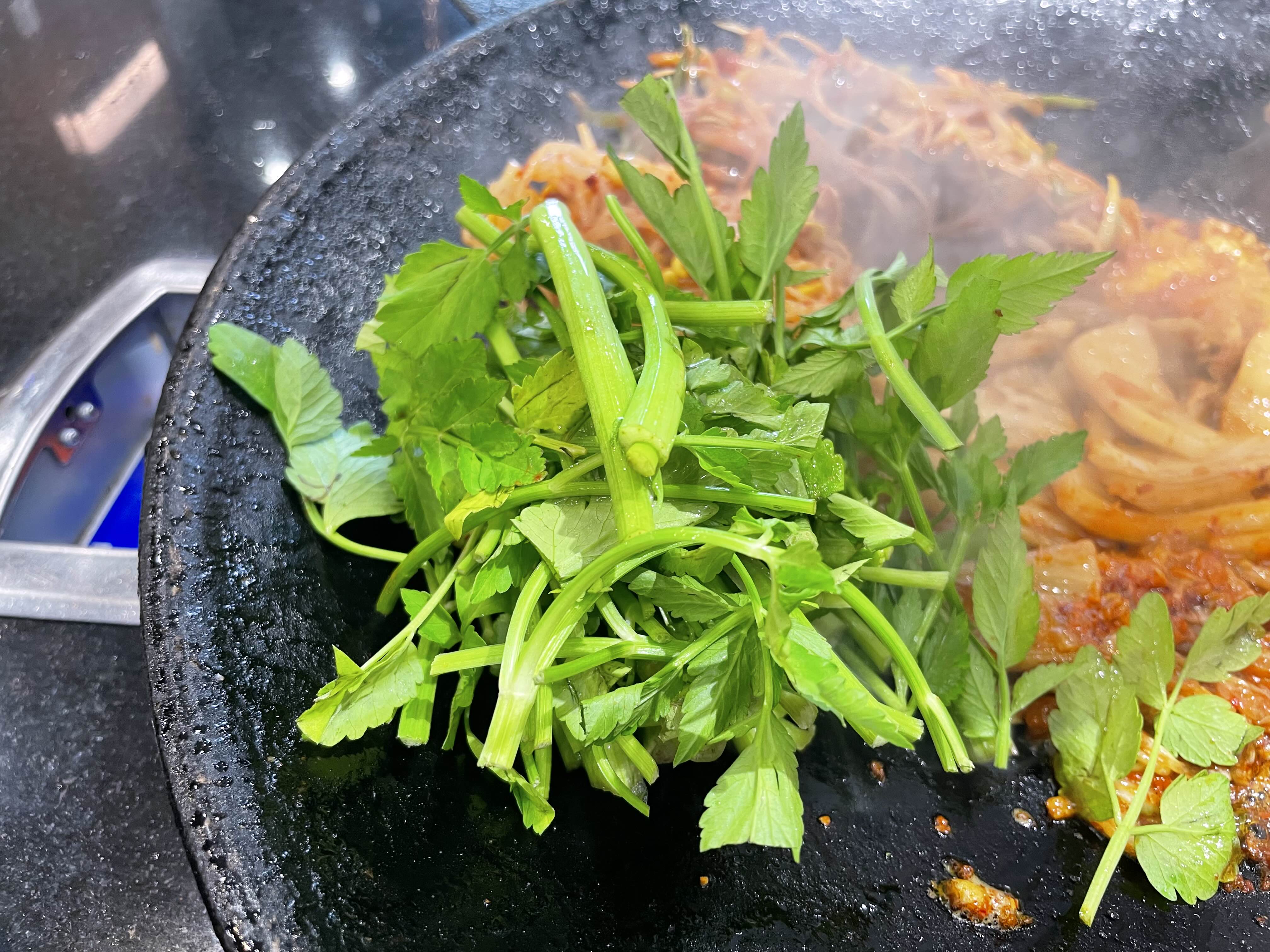 그 상태에서 김치, 파절임, 미나리를 우리가 보는 앞에서 올렸다.