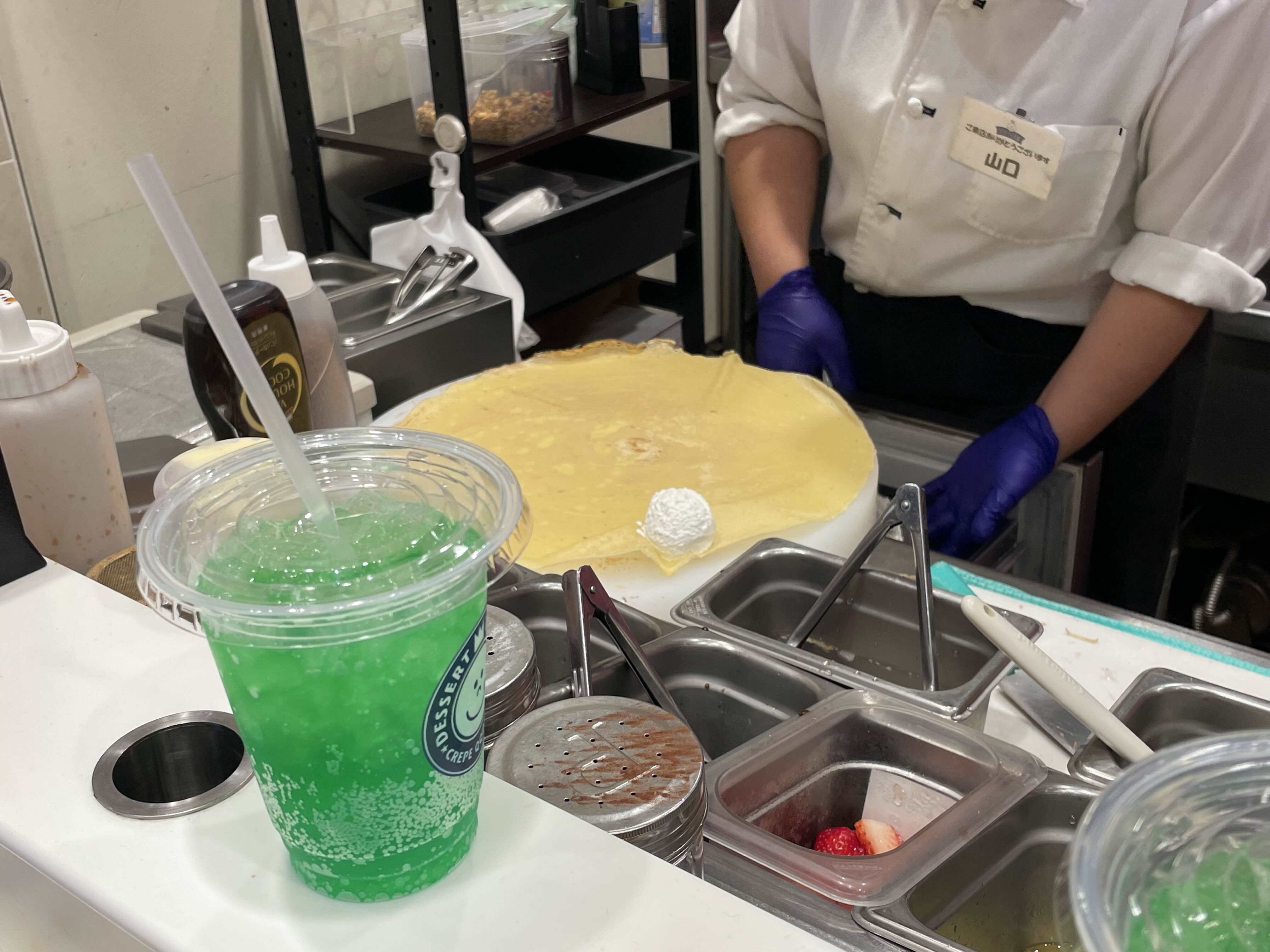 메론 소다와 딸기 초코 아이스크림 크레페를 함께 받으니