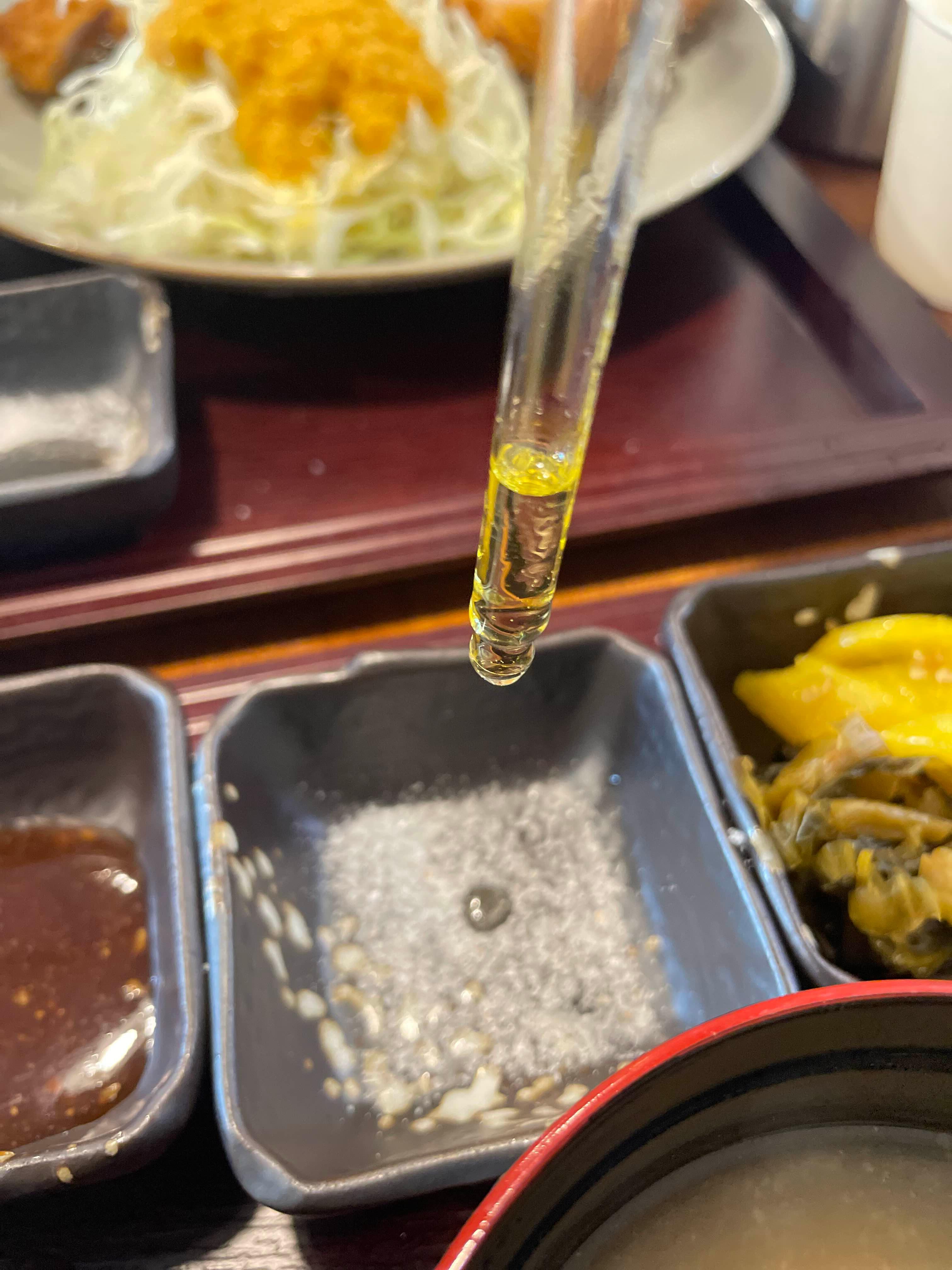 대산카츠를 맛있게 먹는 방법대로 노란색 샐러드 물을 촉촉하게 적셔도 먹었다.