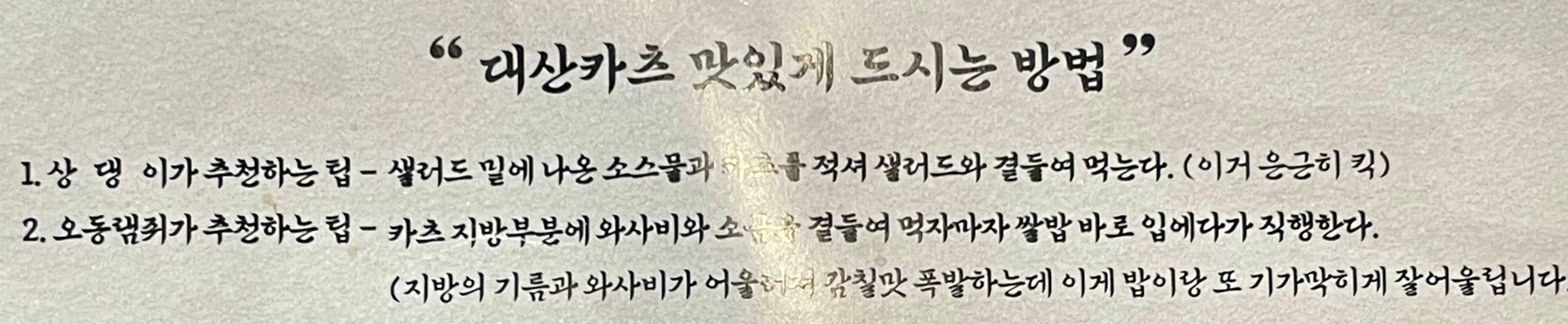 메뉴판 밑에는 '대산카츠'를 맛있게 먹는 방법'에 대해 코멘트가 있다.