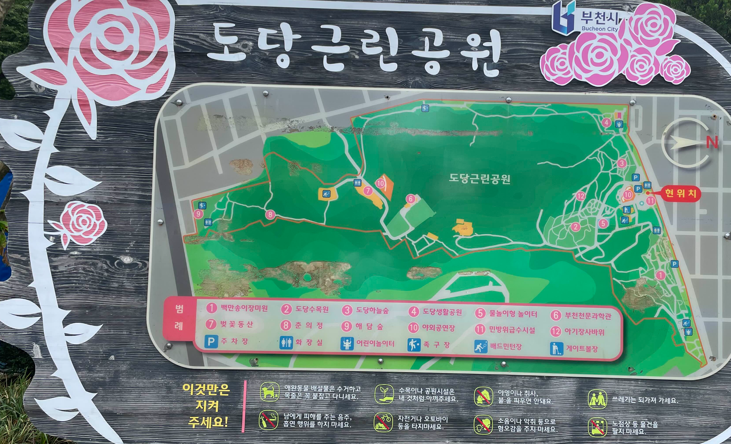 - 7호선 춘의역 7번출구 – 버스 013-4번(장미공원 앞 하차), 50번, 70-2번, 12번, 661번(도당동행정복지센터 하차)