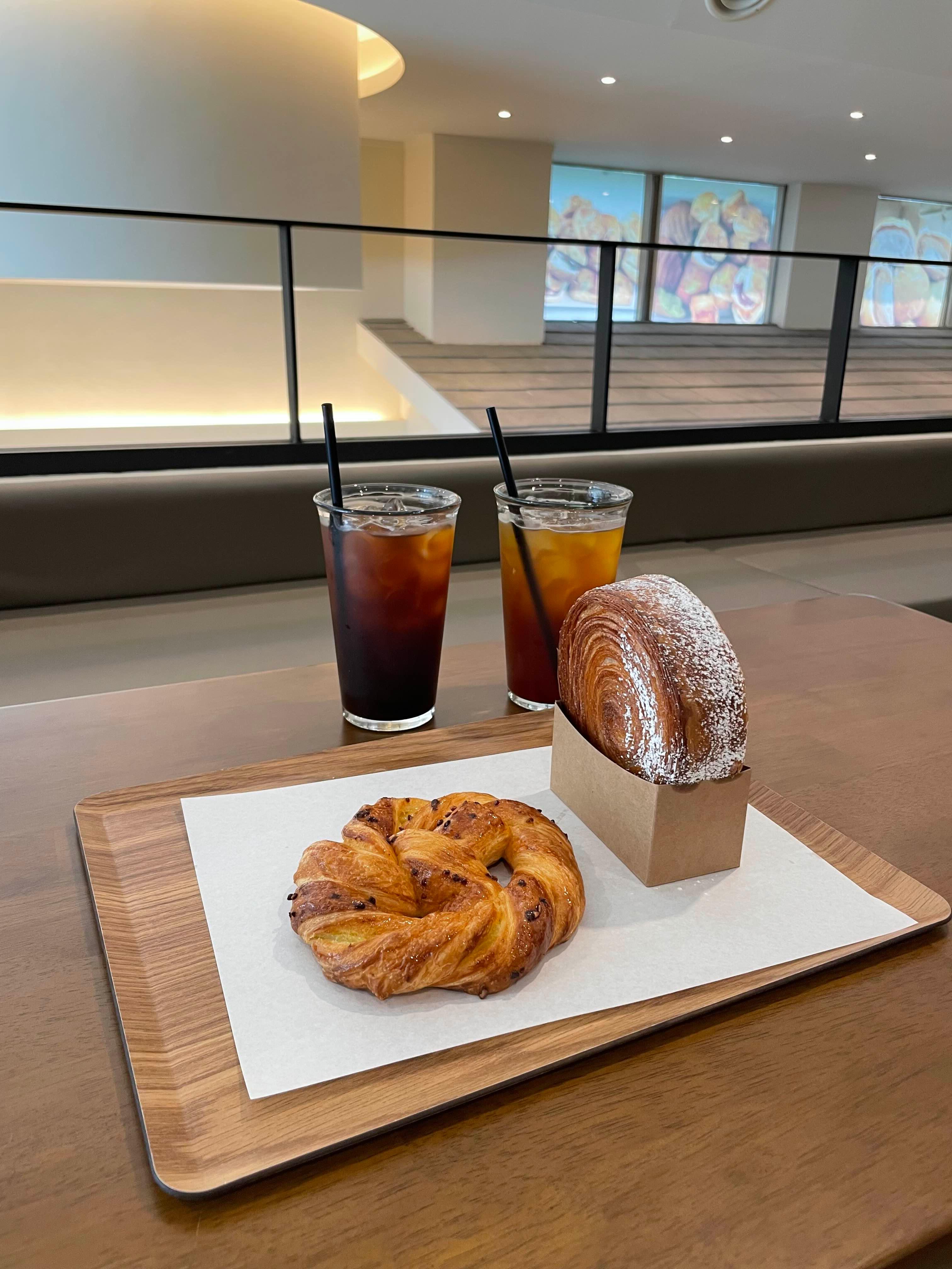 우리는 뉴욕롤과 커스터드 프레즐 그리고 아이스 아메리카노를 마셨다.