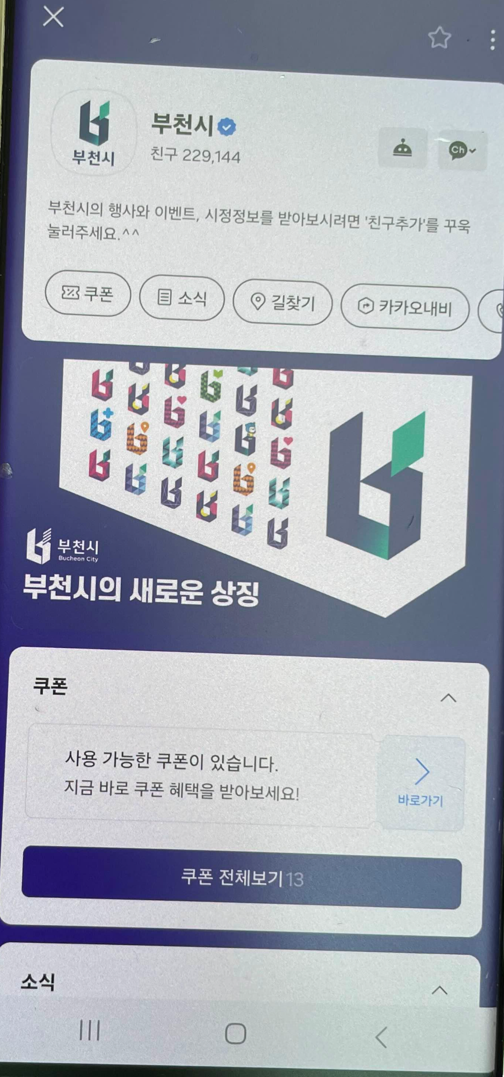 부천시 카카오톡 채널에서는 부천시의 다양한 시설에 대한 쿠폰을 배포하고 있었다.