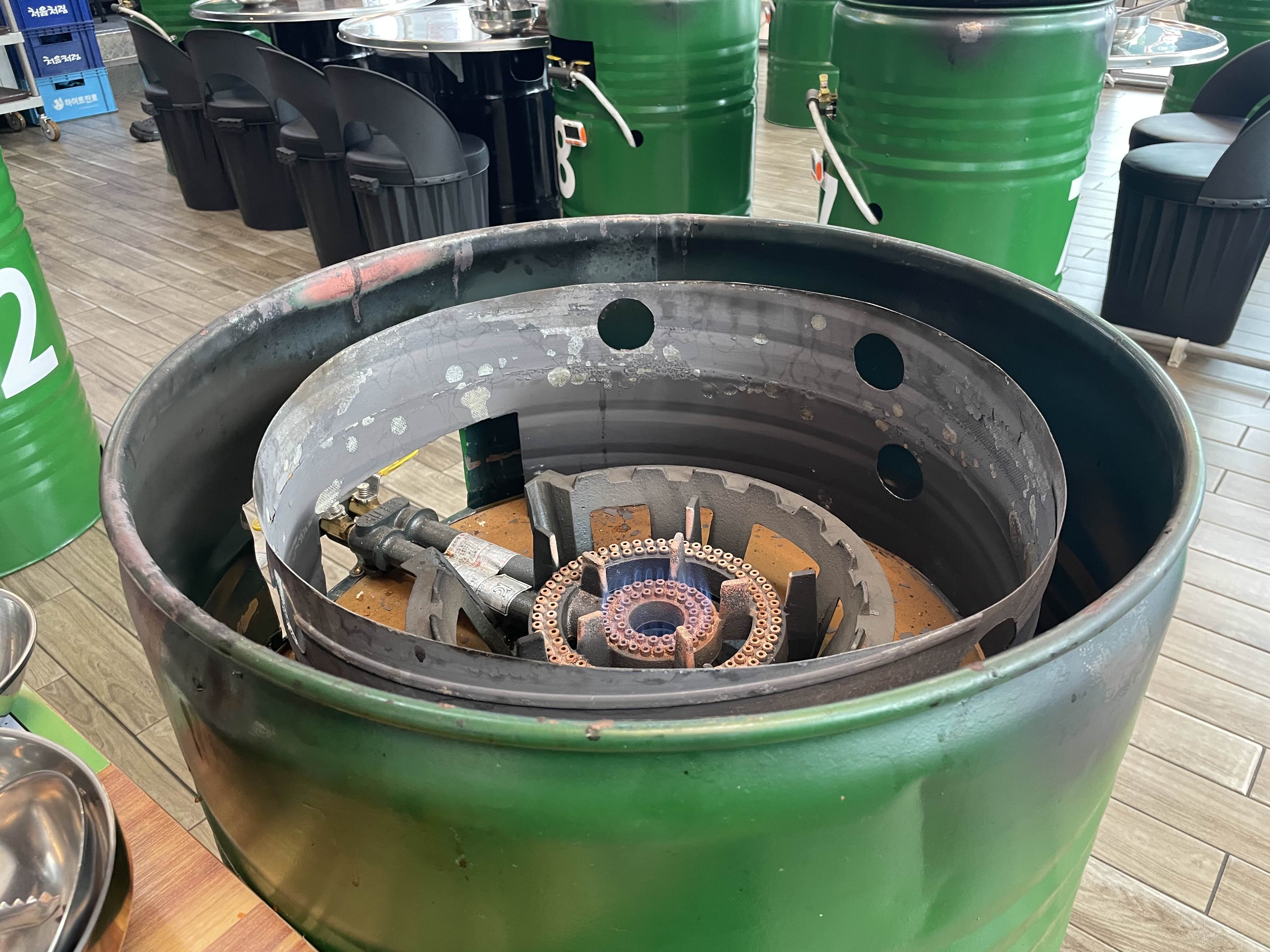초록색 드럼통 안에는 마치 주방 화구를 그대로 가져온 듯 화력 세 보이는 큰 가스레인지가 있었다.