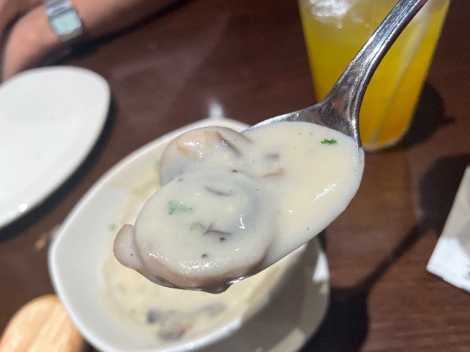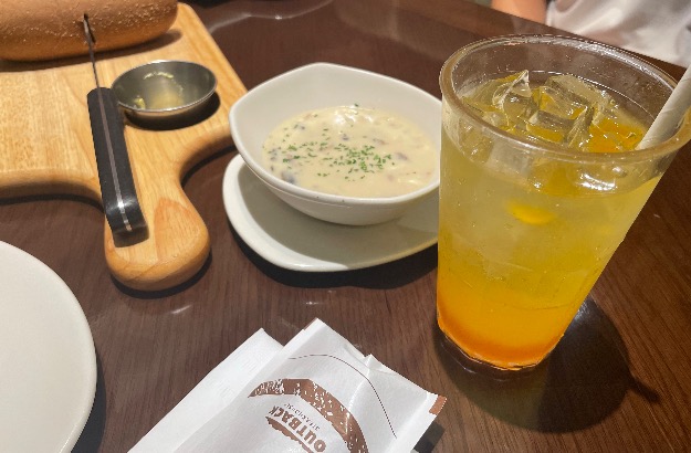 그렇게 아웃백 시그니처인 부시맨 브레드를 잘 녹은 버터를 발라먹고, 런치세트에 포함된 양송이 수프와 망고 에이드를 먹으며 우리 음식을 기다렸다.
