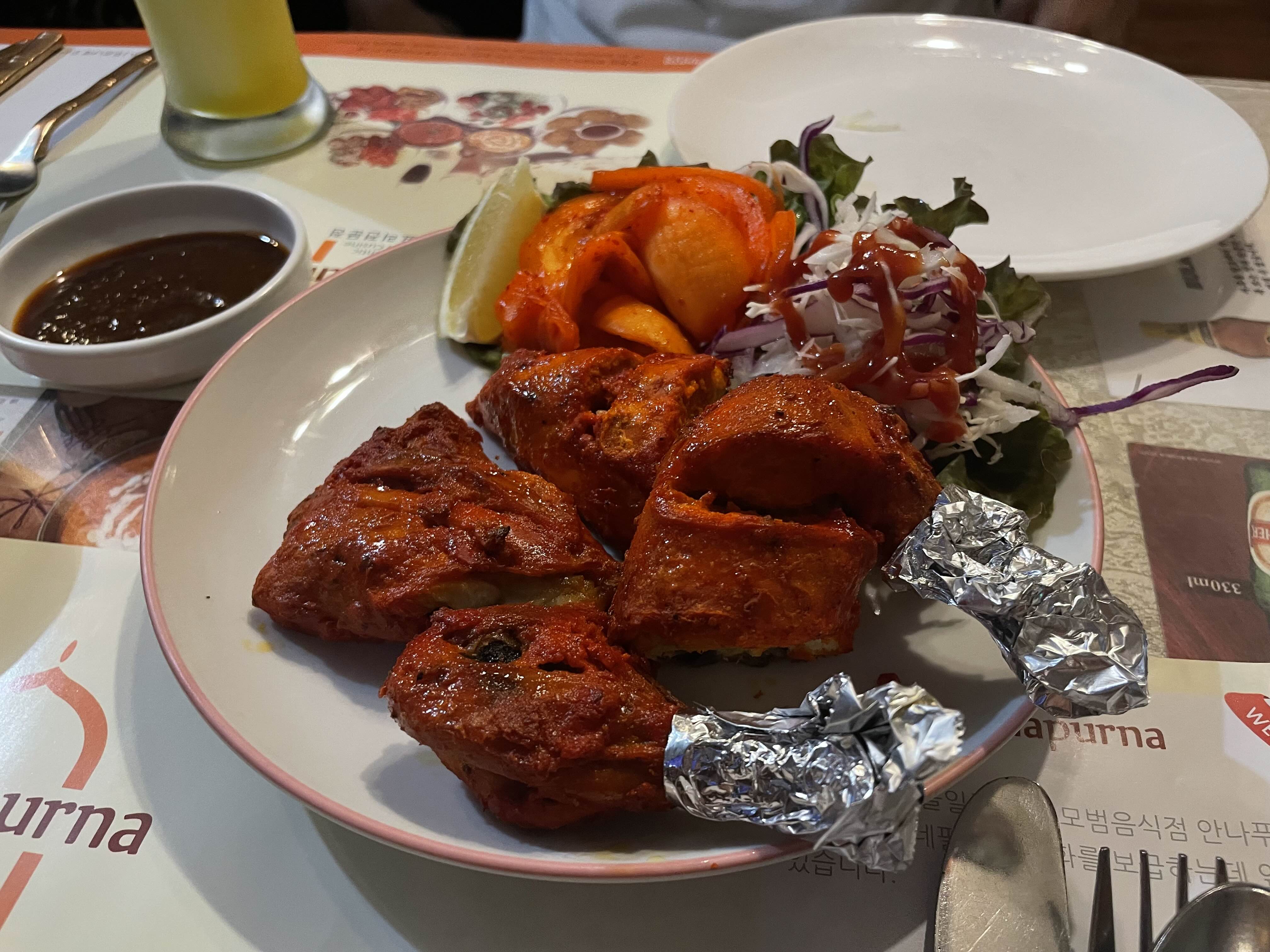 탄두리 치킨도 빨갛게 먹음직스러웠고, 같이 나온 양파 절임이 개운했다.