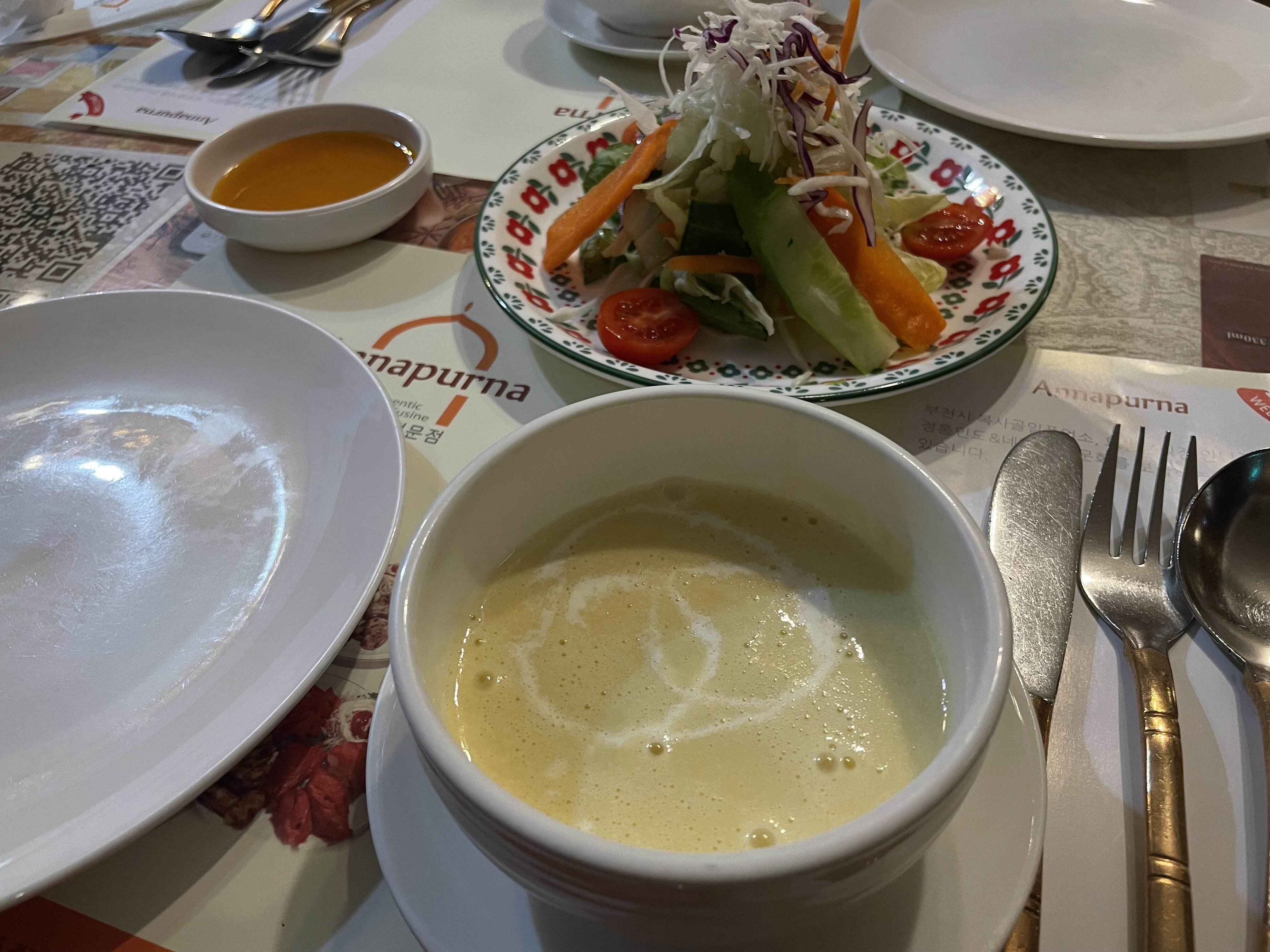 런치세트는 콘스프, 그린 샐러드, 탄두리 치킨 4조각, 커리 1개, 난, 밥, 음료 2개를 고를 수 있었다.