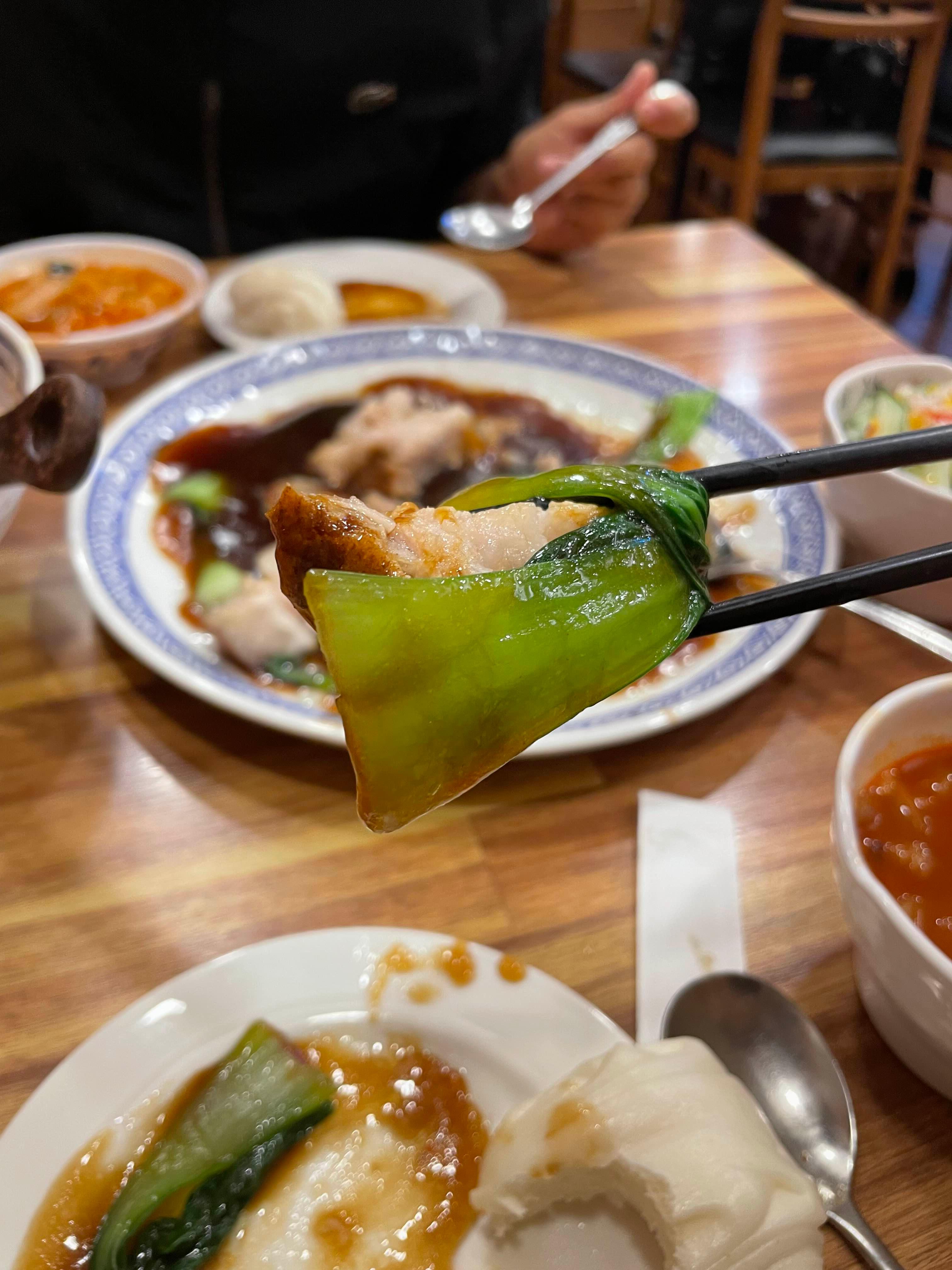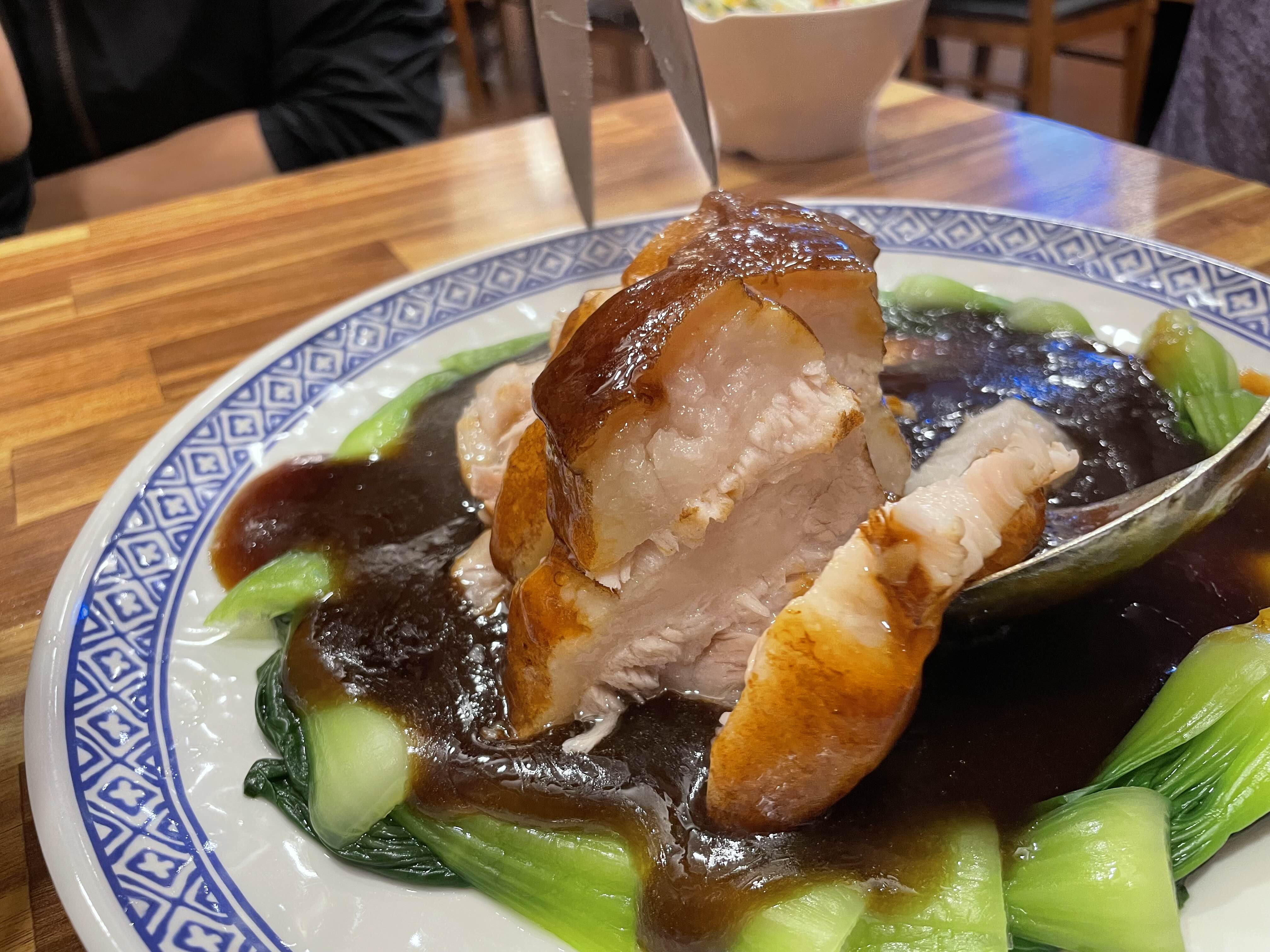 먹기 좋게 자른 동파육 한 점과 청경채, 꽃빵