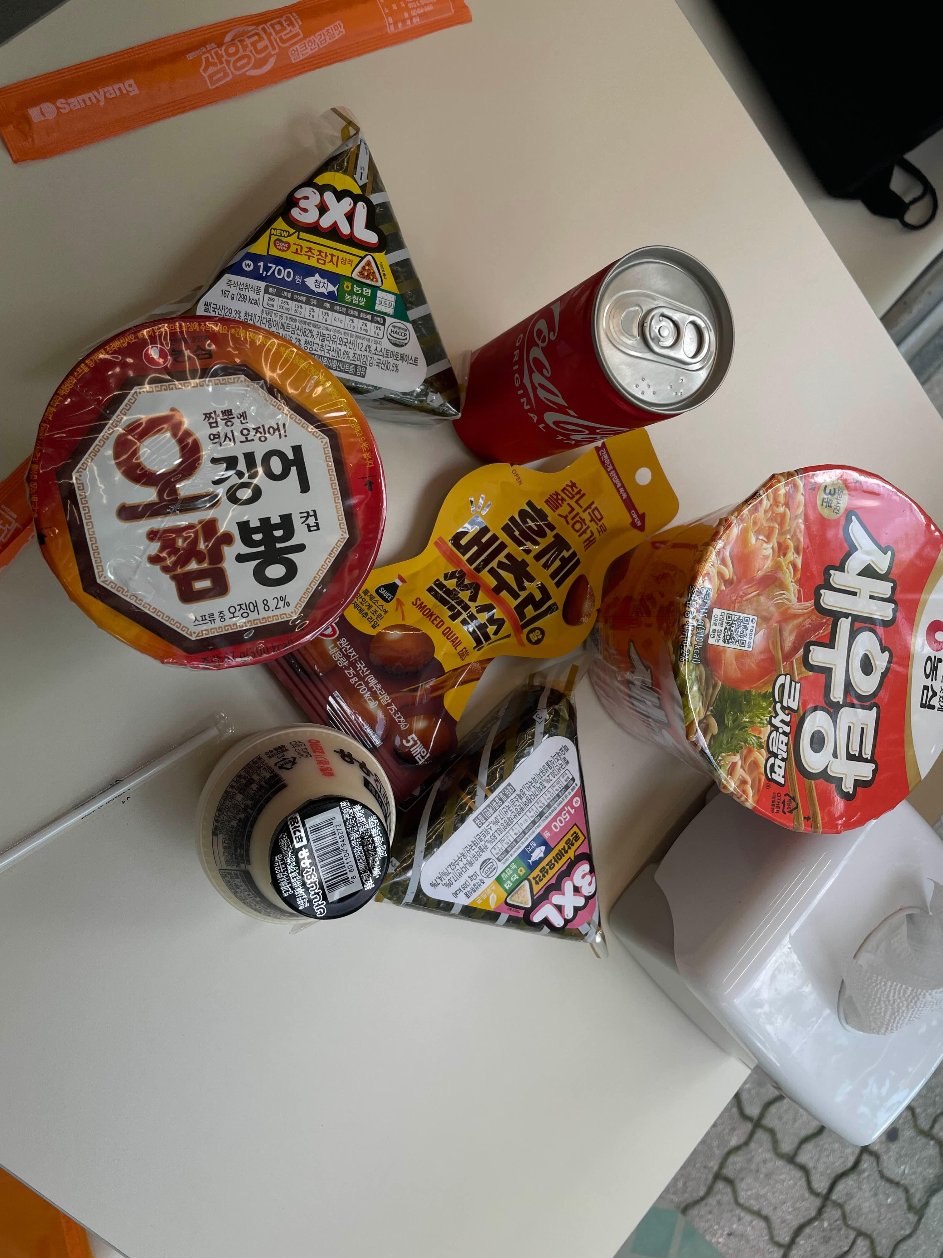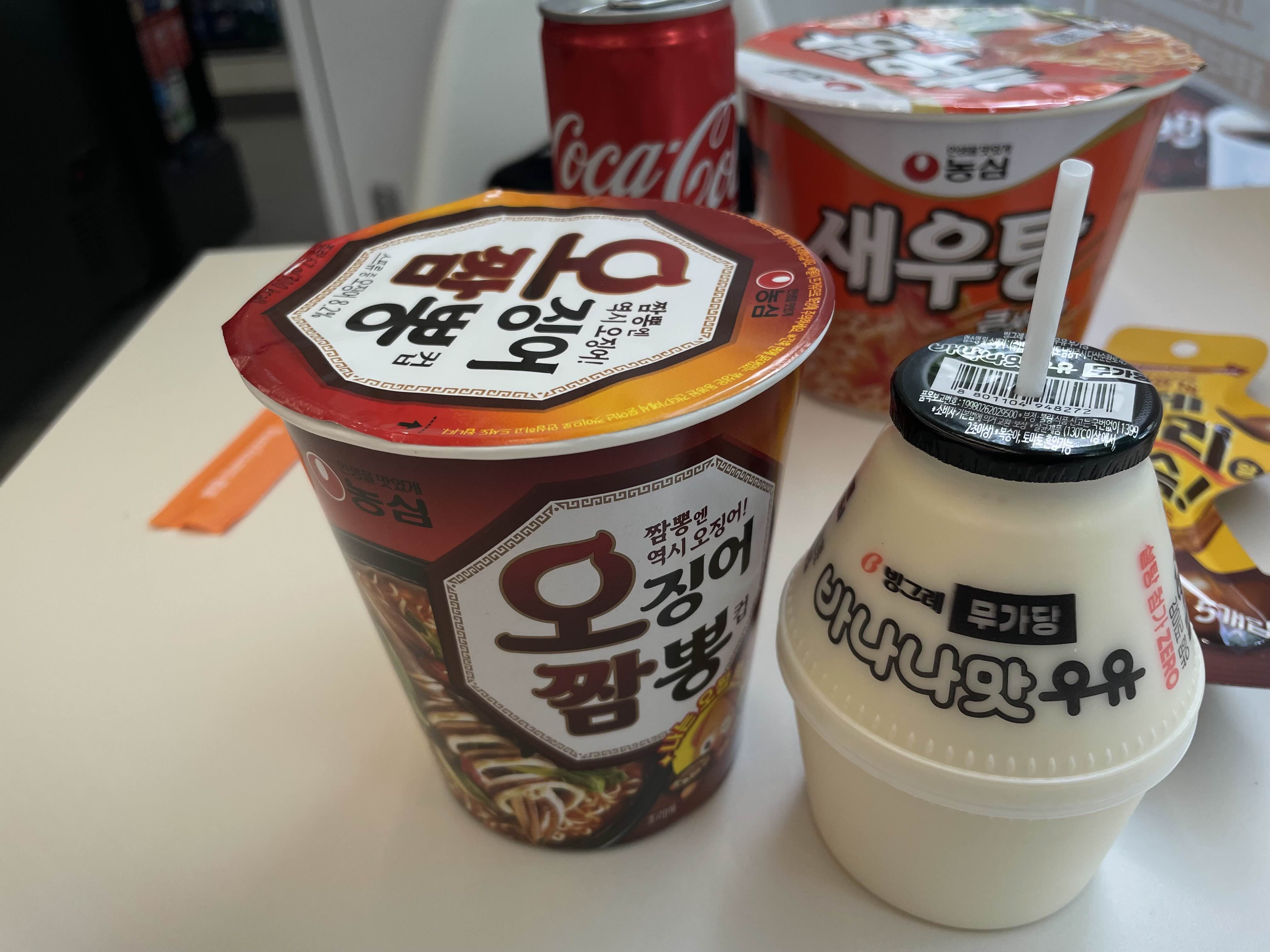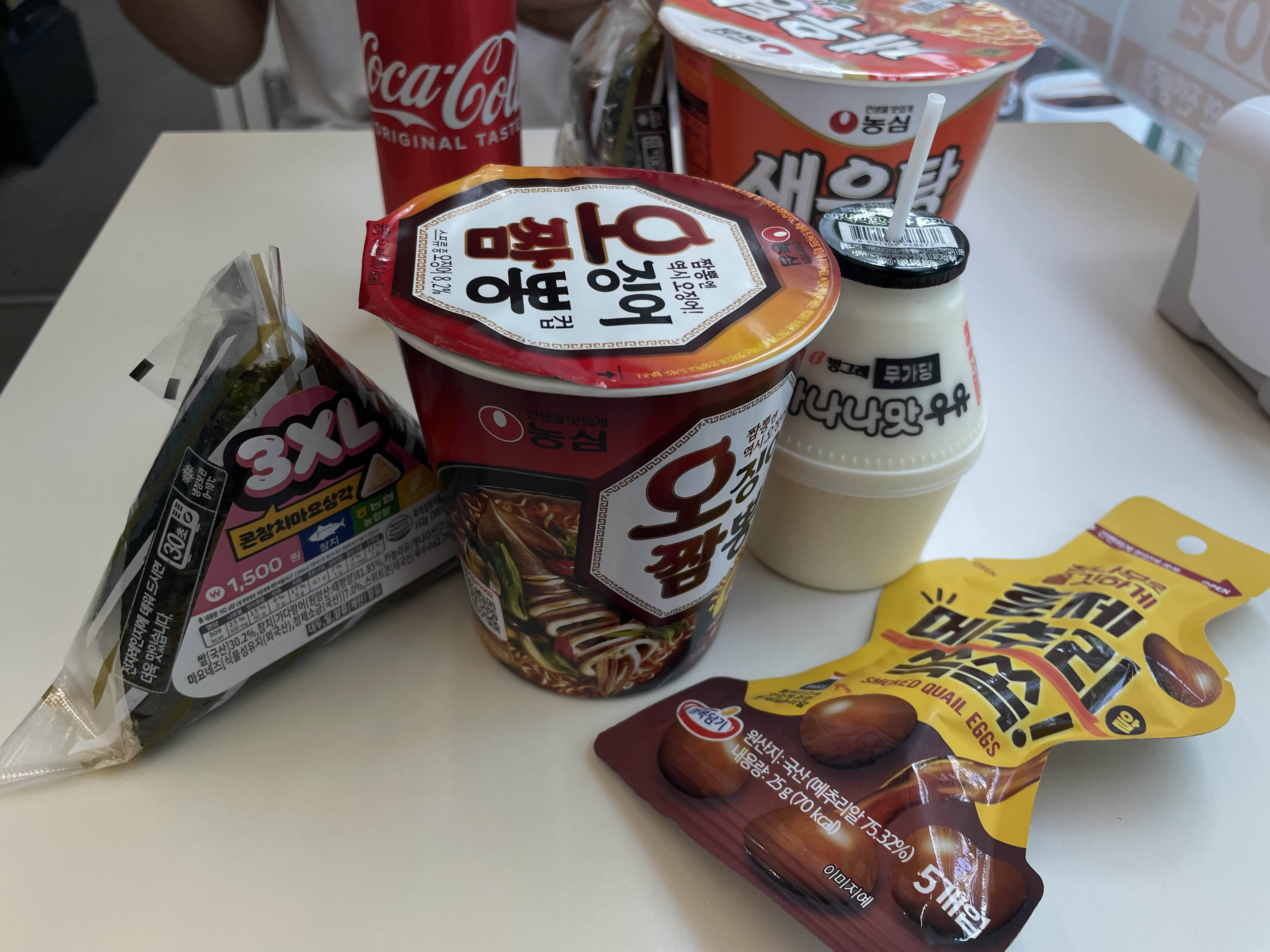 내가 먹고 싶은 컵라면, 삼각김밥, 달달한 음료수로 구성한 나만의 편의점 정식.