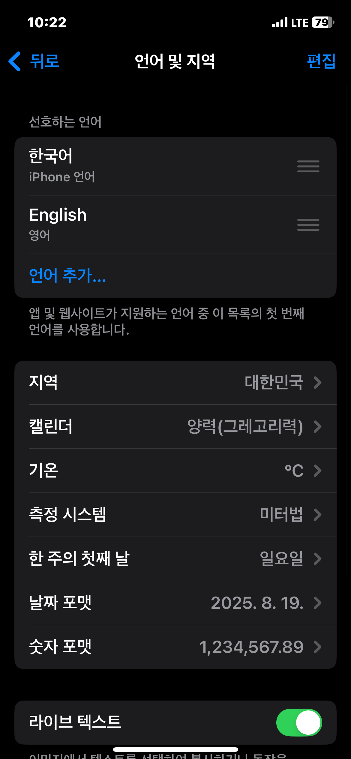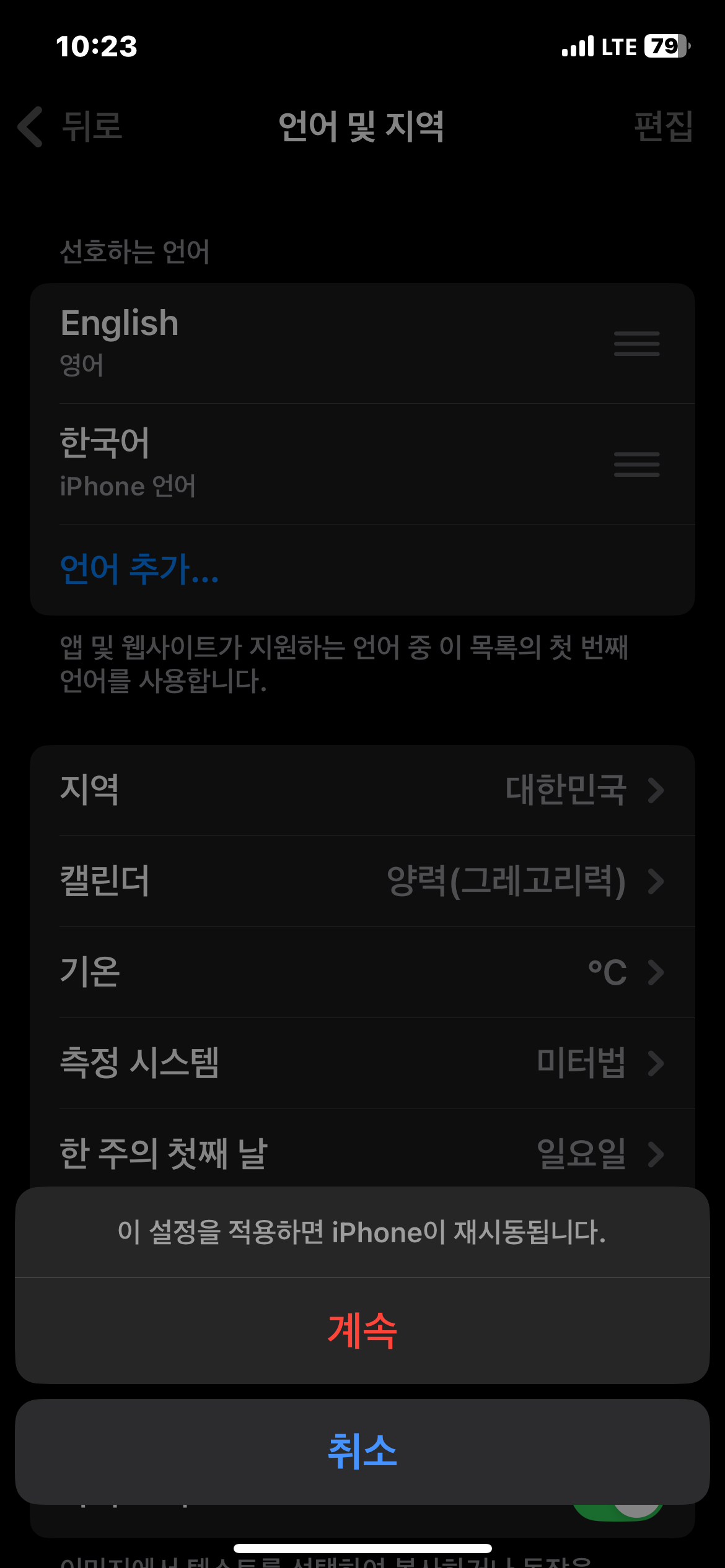 설정 > 일반 > 언어 및 지역 > 한국어랑 영어 순서 바꾸기