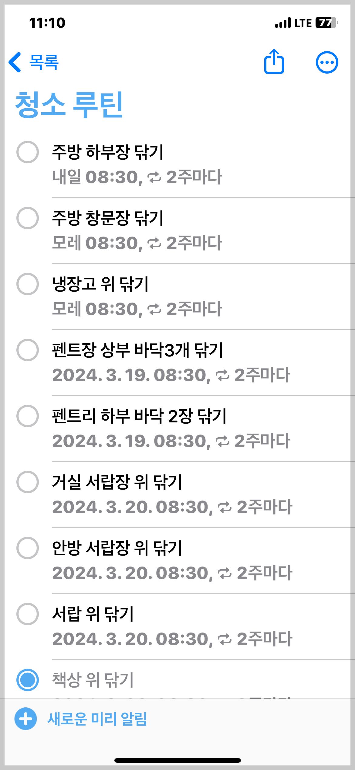 작게 쪼갠 청소 영역 14개 묶음을 미리알림앱에 입력 후 2주마다 반복하여 알려주도록 합니다.