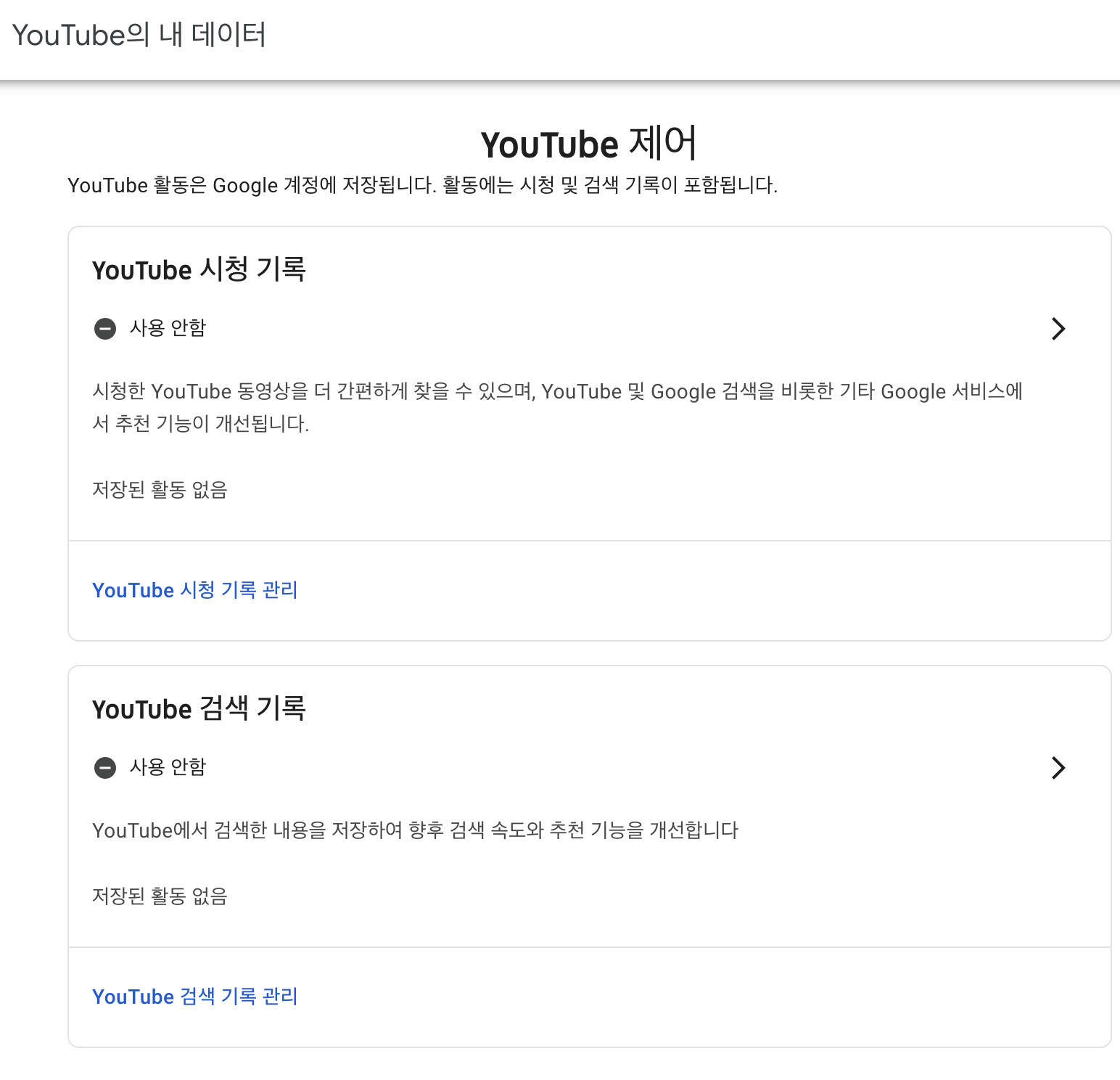 2. Youtube 제어에 보면 각 항목마다 'Youtube 시청 기록 관리', 'Youtube 검색 기록 관리'등을 설정할 수 있습니다. 각각의 항목에 들어가 "사용 중지" 버튼을 클릭합니다.
