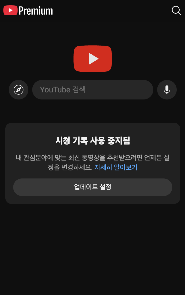 3. 유튜브 화면이 알고리즘으로 추천하는 영상이 나오지 않고 검색 화면만 뜨게 됩니다.