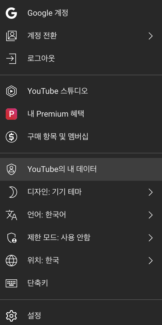 여기서 Youtube의 내 데이터 항목에 들어갑니다.