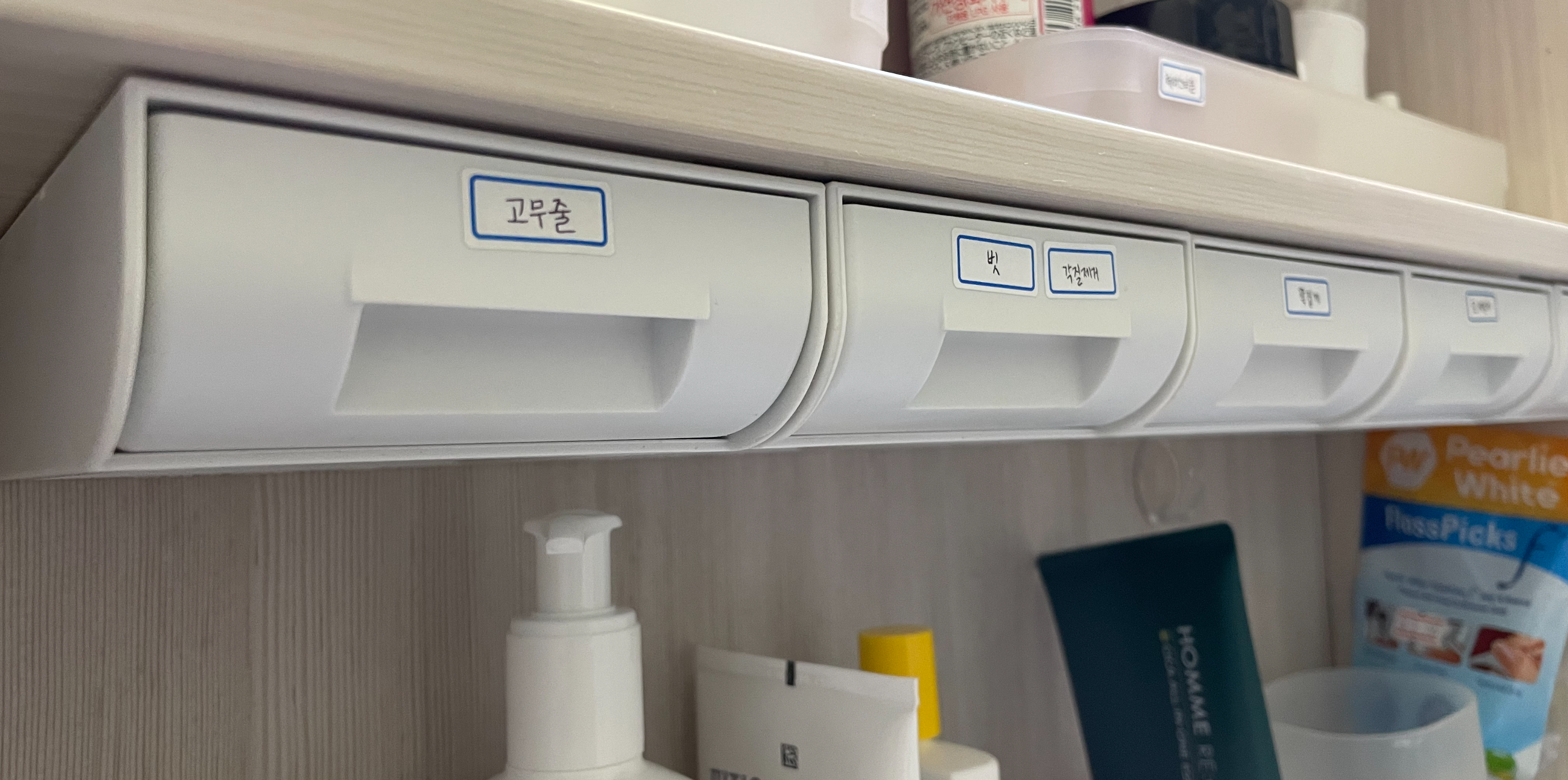이럴 때 부착식 서랍장 소형을 욕실장 바닥에 붙여서 이런 잡동사니를 보관한다.