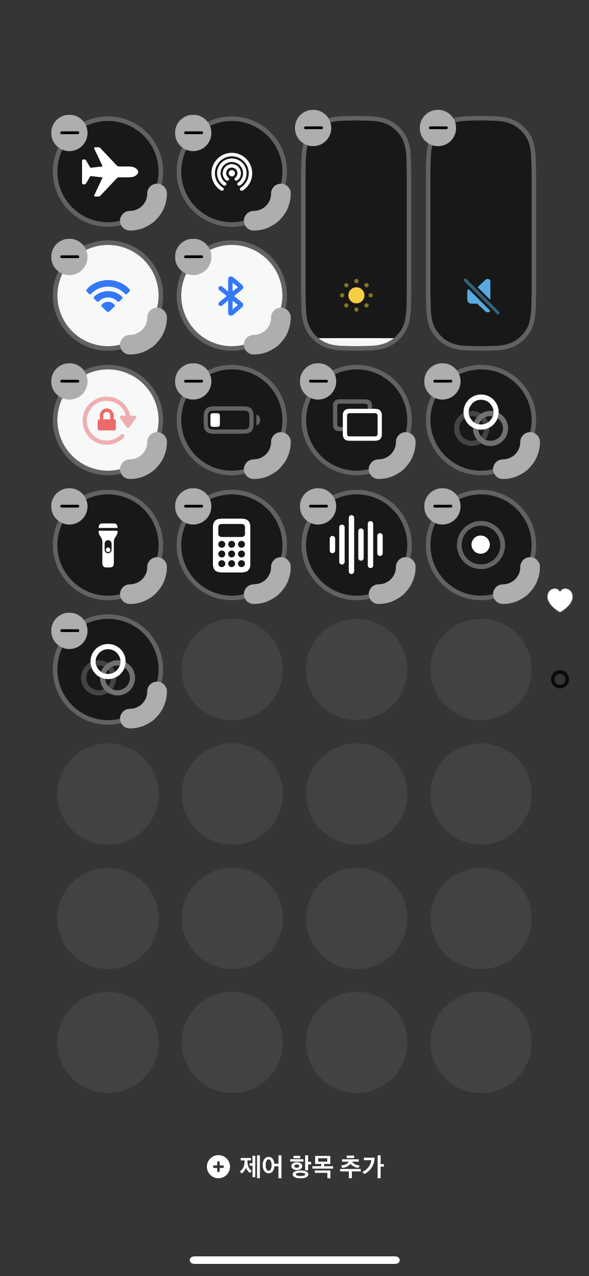 - 제어센터 화면에서 빈 화면을 꾸욱 누르면 메뉴를 추가할 수 있는 화면이 됩니다.