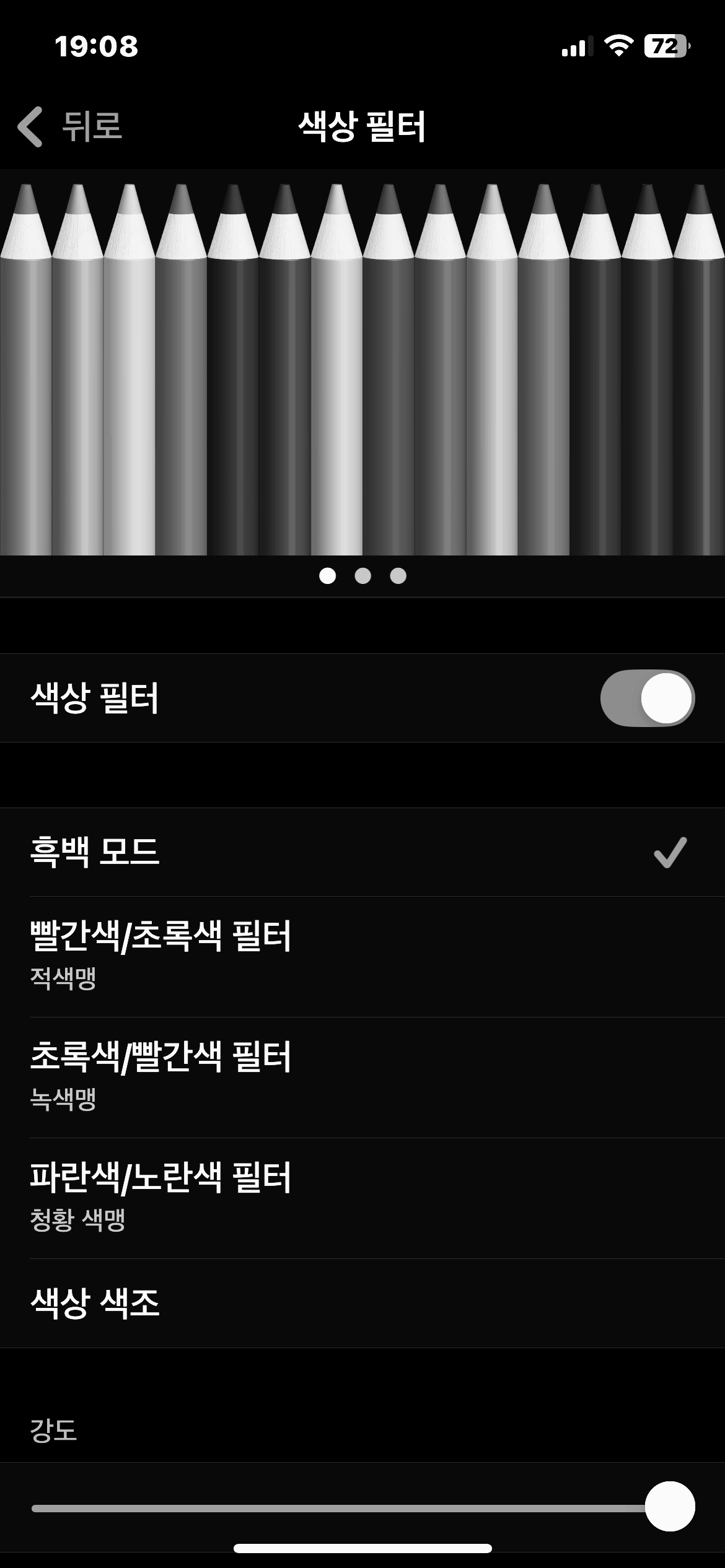 - 반대로 다시 컬러모드로 바꾸고 싶다면, 1~2 방법으로 메뉴를 접속한 뒤 색상 필터 토글을 끄면 됩니다.