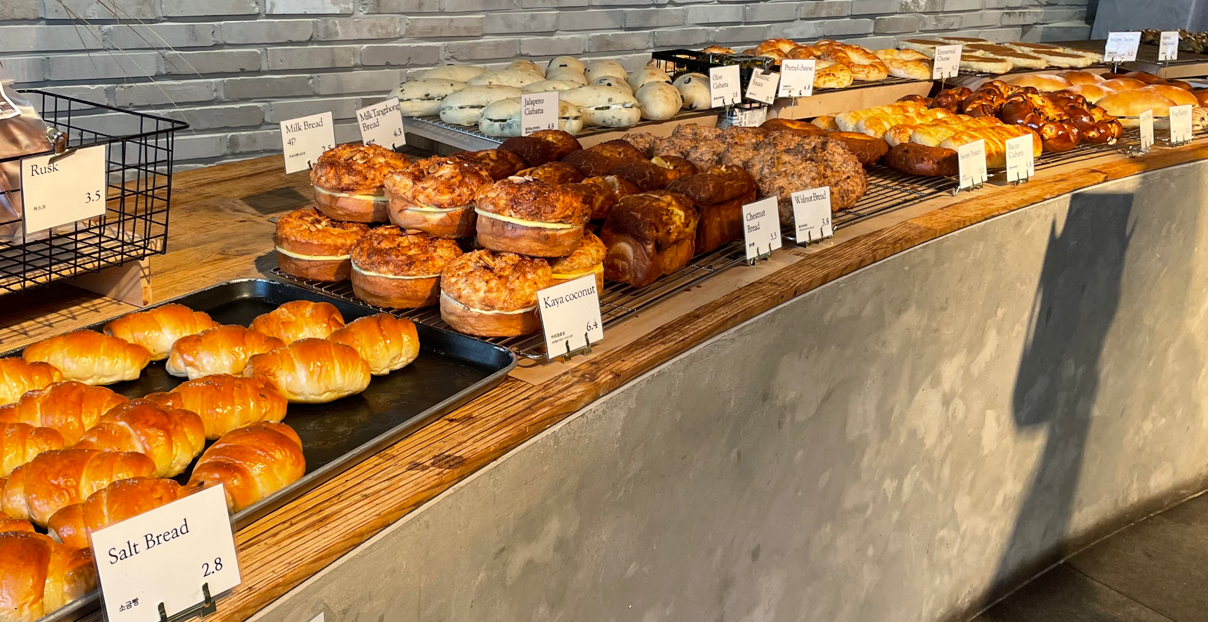 문을 열자마자 맛있는 빵이 자연스러운 동선에 있다.