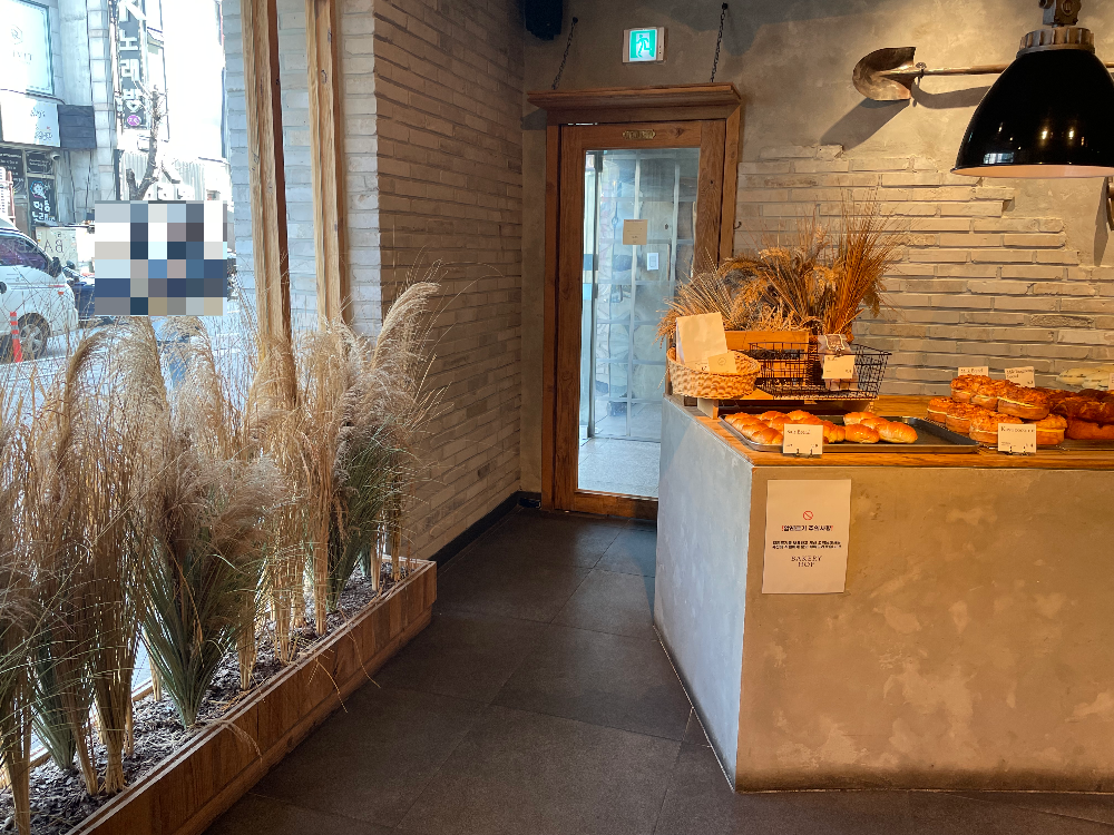 빵을 전시해놓은 곳과 빵을 먹을 수 있는 곳이 바닥 내 타일로 구분되어 있다.