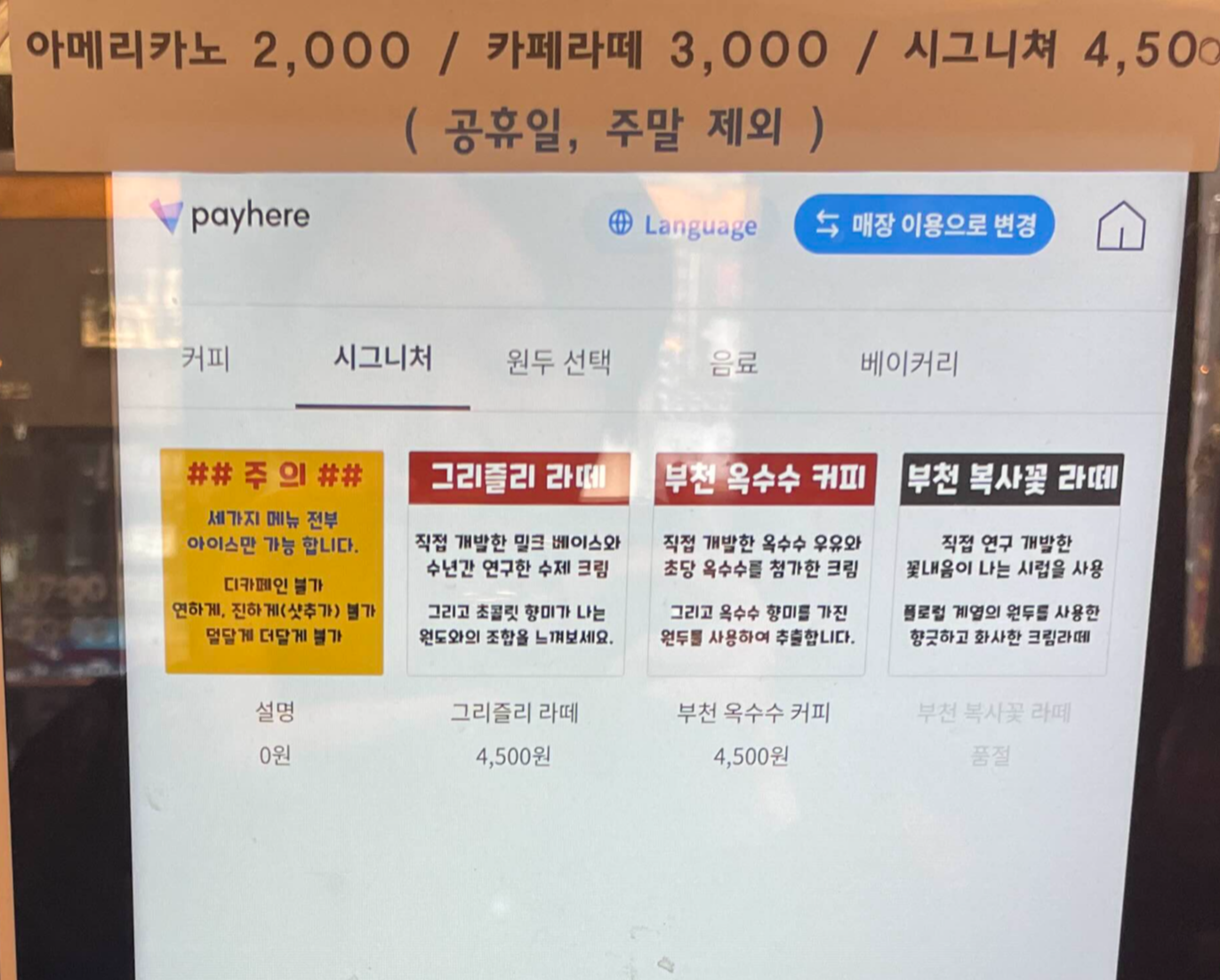 이런 시그니처 음료는 메뉴판에는 5,500원이었는데 키오스크 주문을 하려 보니 4,500원이었다.