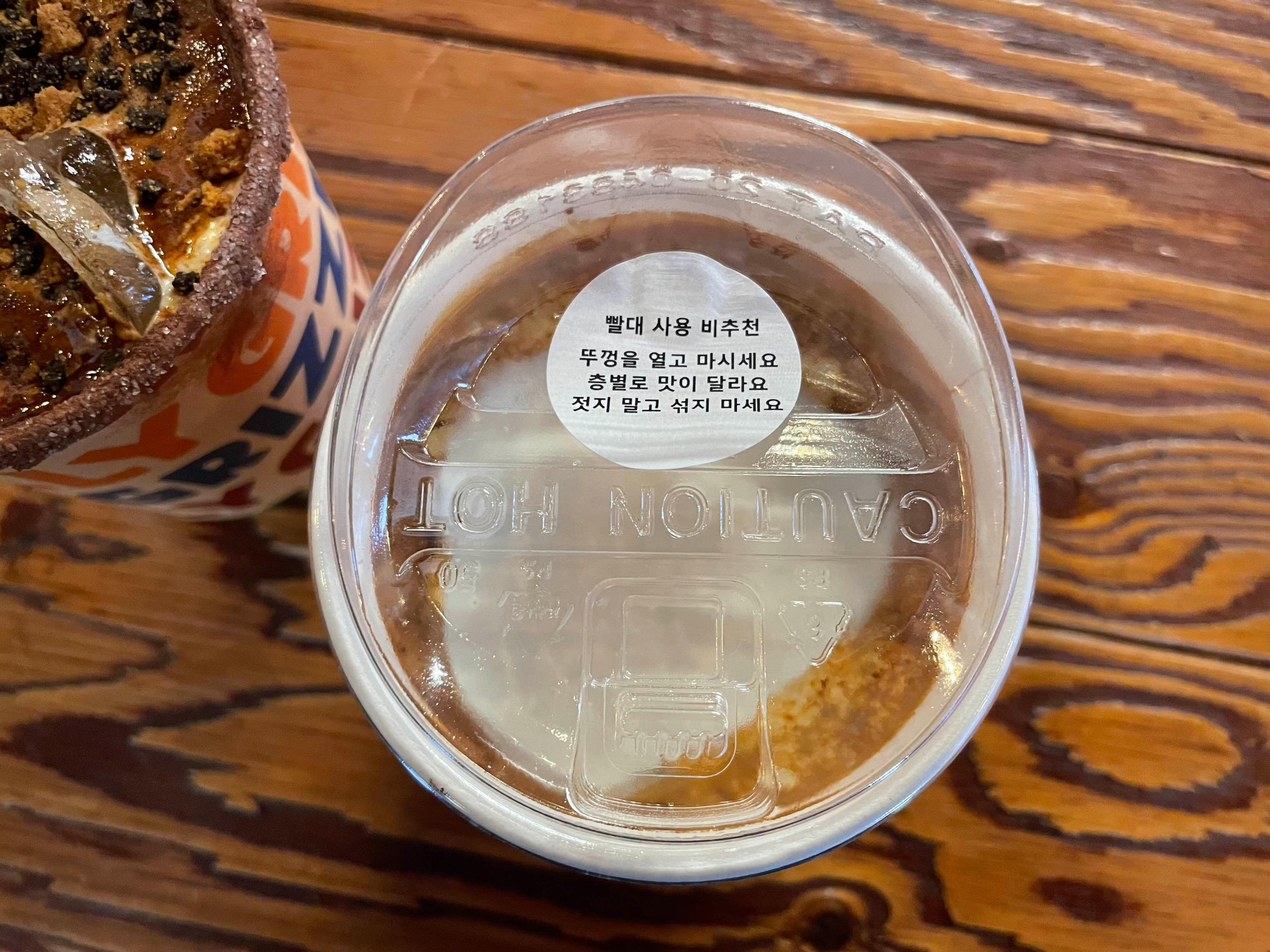 빨대 사용 비추천. 뚜껑을 열고 마시세요. 층별로 맛이 달라져요. 젓지 말고 섞지 마세요
