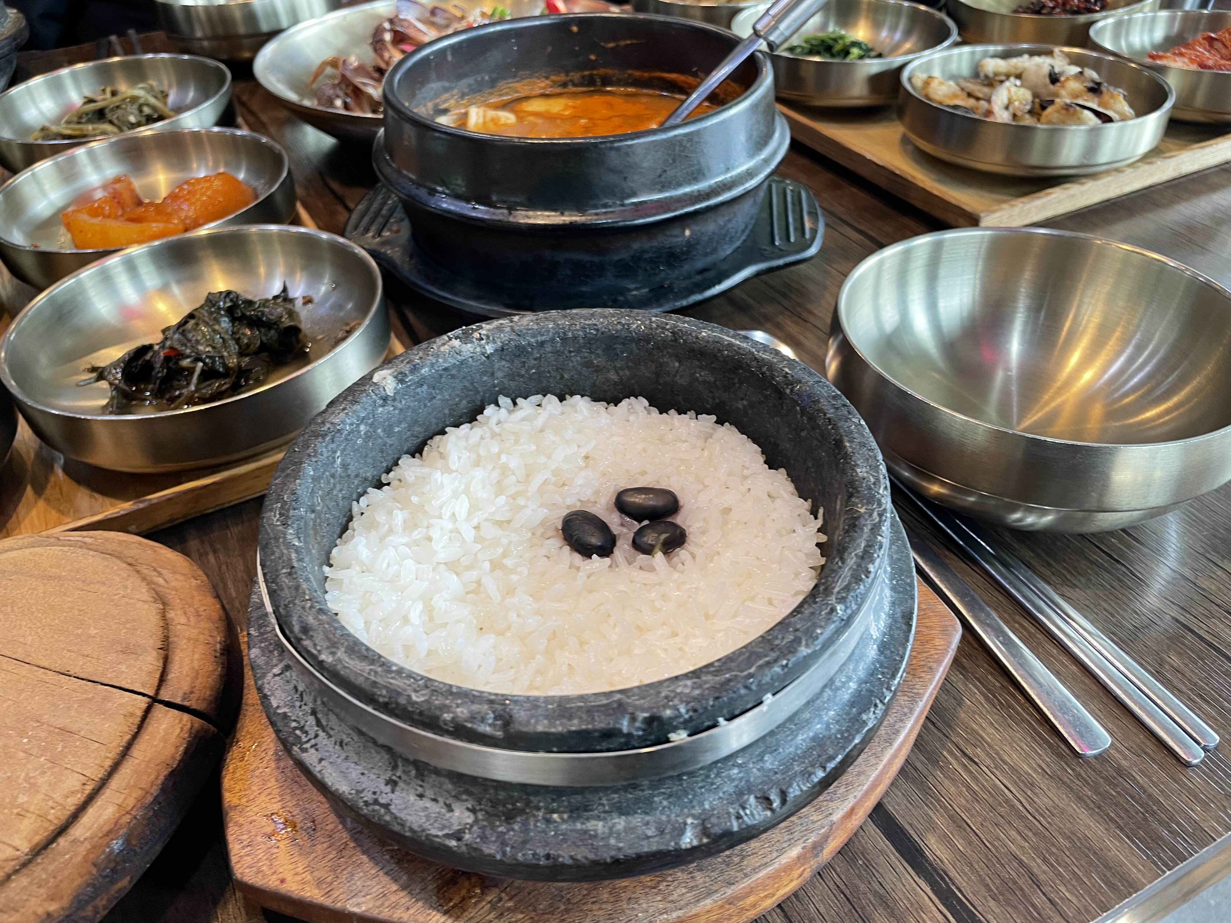 여기 돌솥밥에 약콩 3알이 좀 야박해 보이기는 한데, 데코레이션이라고 생각하면 귀엽다.