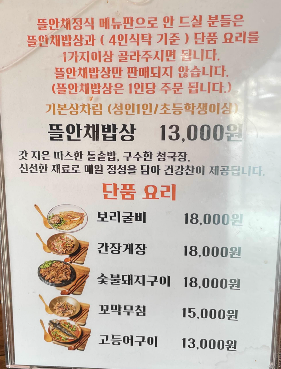 1인 정식 메뉴(기본 상차림 + 메인 메뉴)도 있긴 했는데