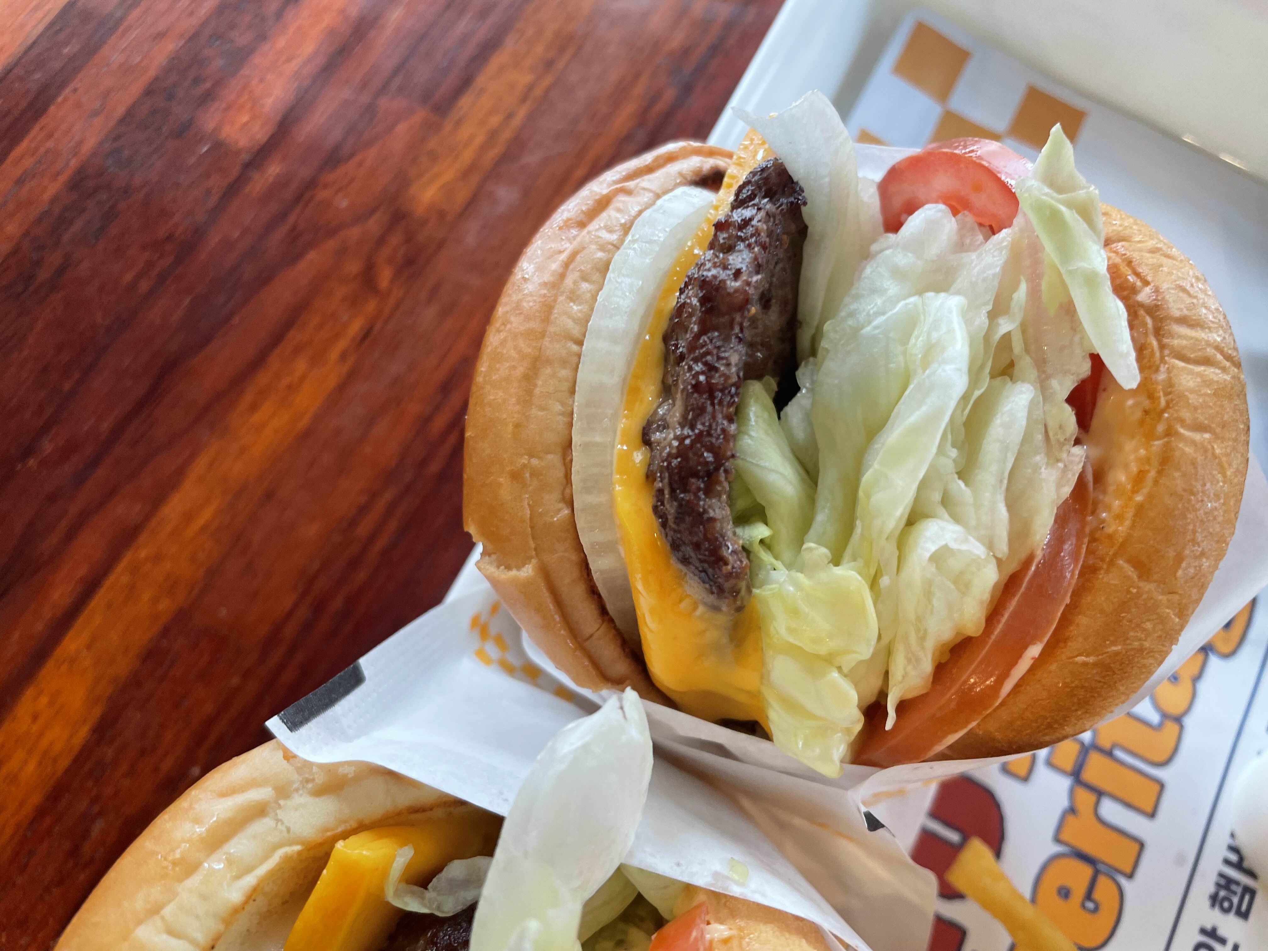 풍성한 채소, 육즙이 잘 가둬진 패티, 2장의 치즈, 노릇하게 위아래로 구운 버터번의 조합이