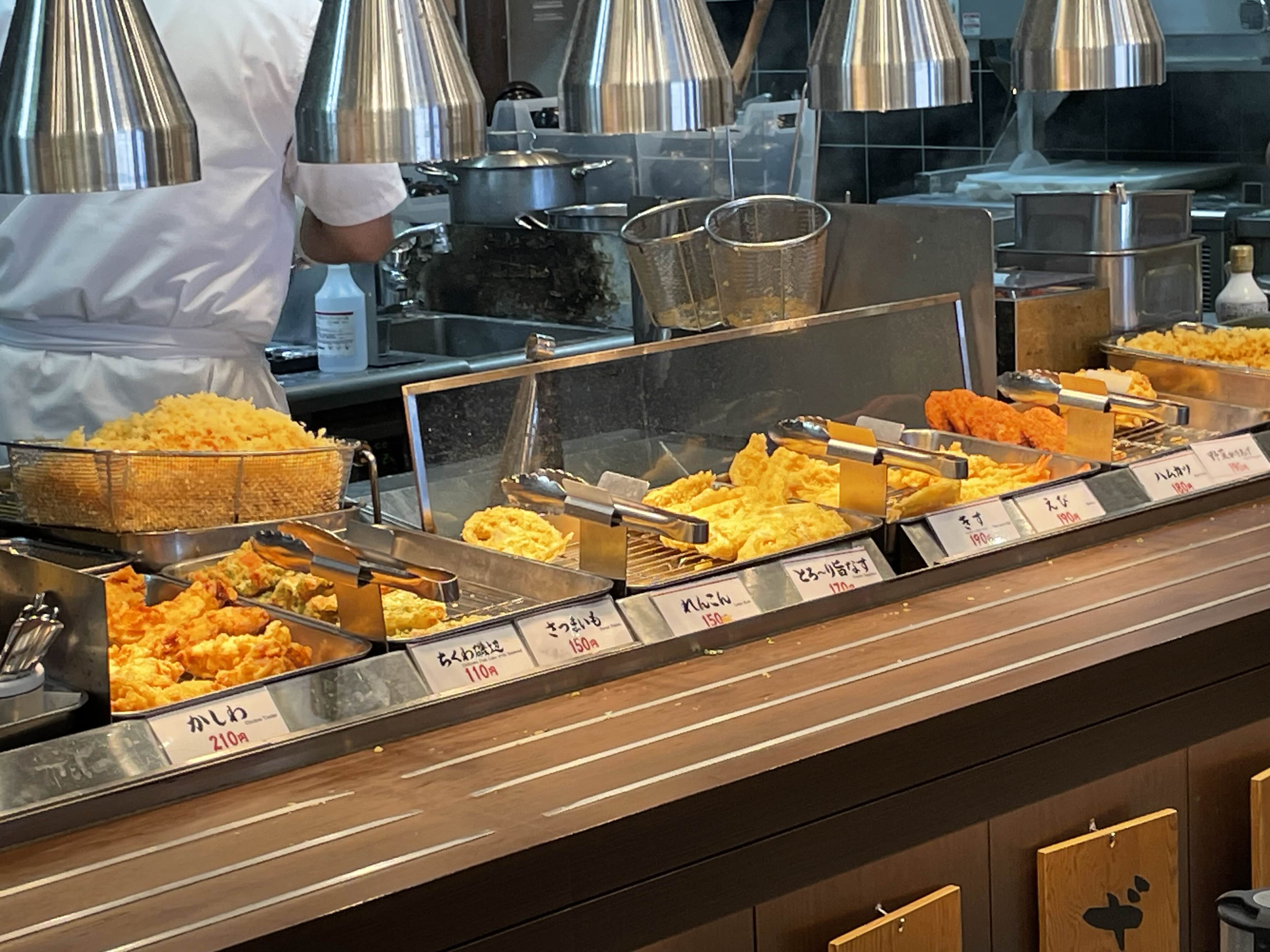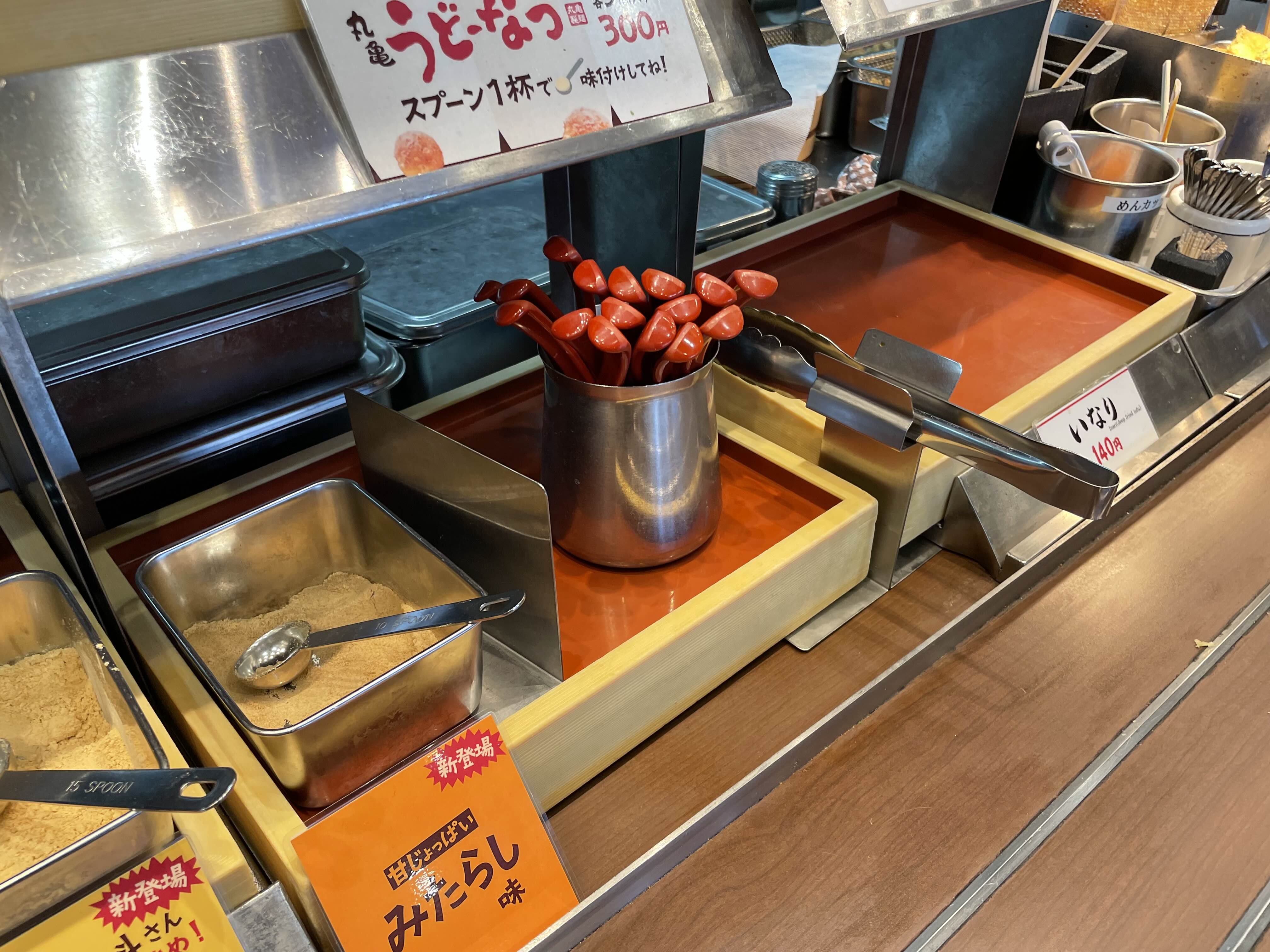 마루가메 제면은 왼쪽에서 메뉴를 고르고 오른쪽으로 이동하면서 재료를 담고 계산하는 시스템이다.