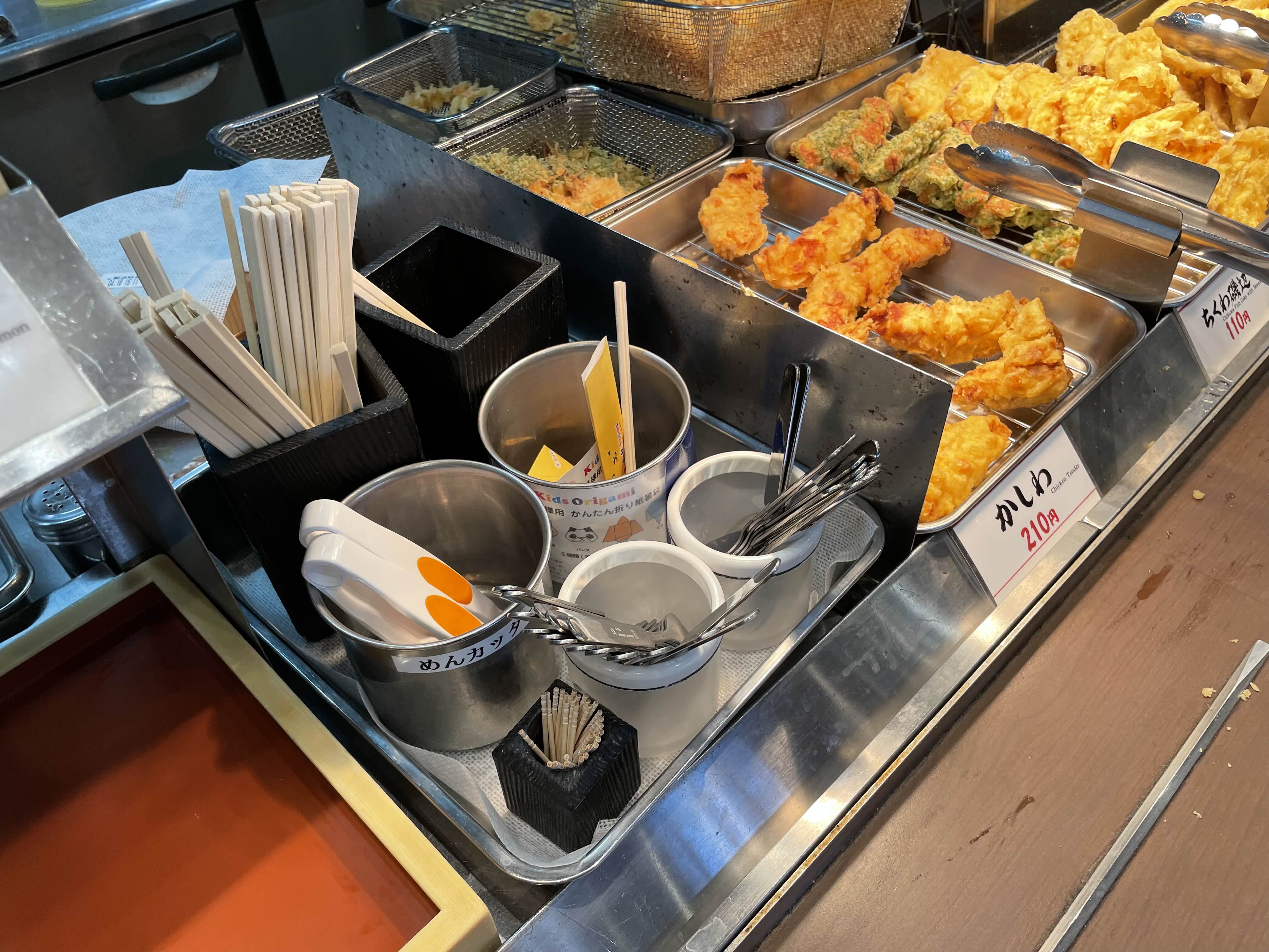 마루가메 제면은 왼쪽에서 메뉴를 고르고 오른쪽으로 이동하면서 재료를 담고 계산하는 시스템이다.